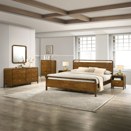 Roundhill Furniture Eldren Wood Bedroom Set, Platform Bed with Dresser, Mirror, Two Nightstands, Chest in Walnut Finish