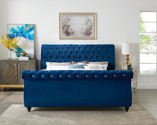 Roundhill Furniture Evora Velvet Upholstered Crystal Button Tufted Sleigh Bed, Blue