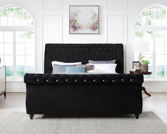 Evora Black Velvet Upholstered Crystal Button Tufted Sleigh Bed