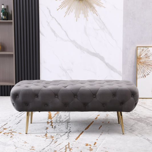 Sira Velvet Button Tufted Bench with Gold Metal Legs, Gray