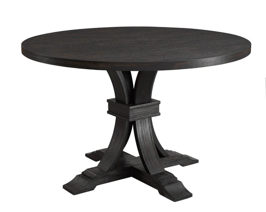 Siena Distressed Black Finish 5-Piece Dining set, Pedestal Round Table with Gray Upholstered Chairs