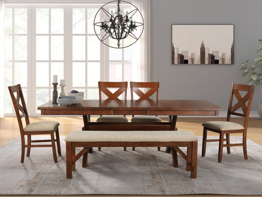 Karven Wood 6-Piece Dining Set, Extendable Trestle Dining Table with 4 Chairs and Bench, Dark Hazelnut