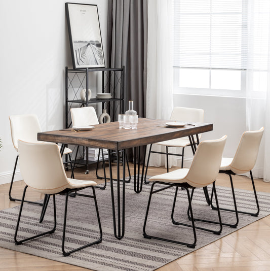 Roundhill Furniture Aryven Industrial Dining Set with Rustic Dark Pine Table and 6 Faux Leather Chairs in Antique White, 7-Piece