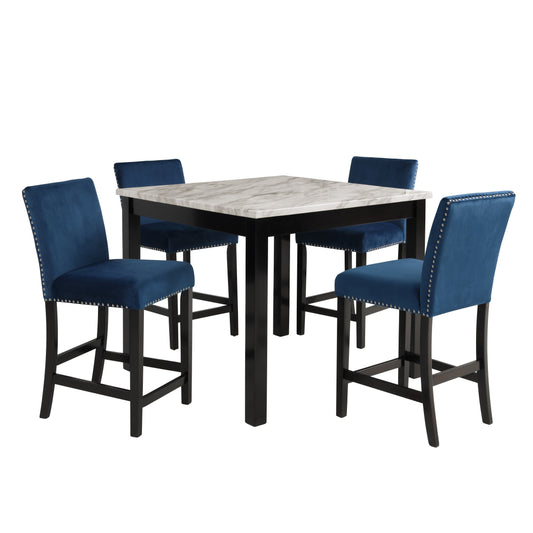 Cobre Contemporary Faux Marble Counter Height Dining Table with 4 Velvet Nailhead Trim Stools, Blue