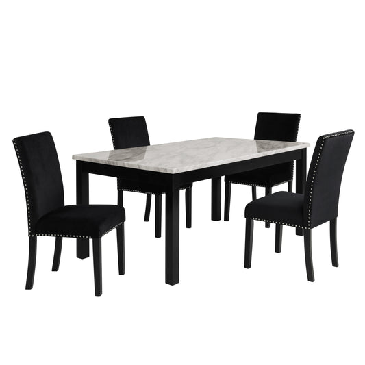 Cobre Contemporary Faux Marble Dining Table with 4 Velvet Nailhead Trim Dining Chairs, Black