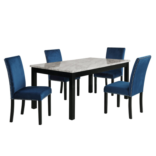 Cobre Contemporary Faux Marble Dining Table with 4 Velvet Nailhead Trim Dining Chairs, Blue