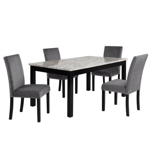 Cobre Contemporary Faux Marble Dining Table with 4 Velvet Nailhead Trim Dining Chairs, Gray
