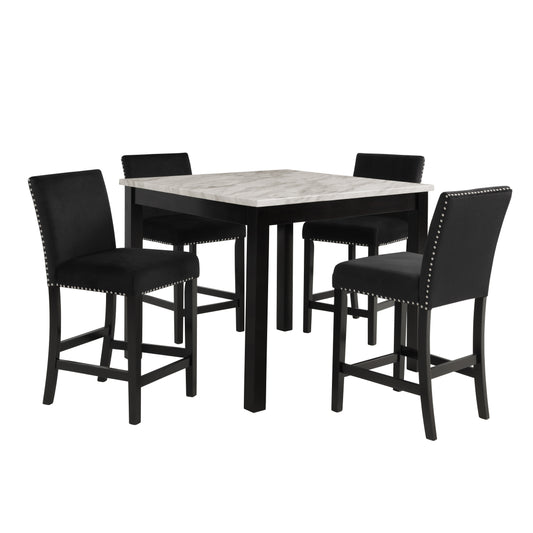 Cobre Contemporary Faux Marble Counter Height Dining Table with 4 Velvet Nailhead Trim Stools, Black