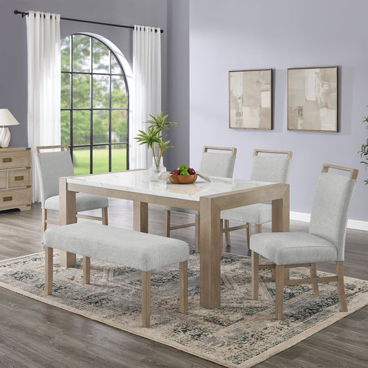 Roundhill Furniture Zelalle 6-Piece Dining Set, Table, 4 Chairs, and Bench, White Wired-Brushed Finish