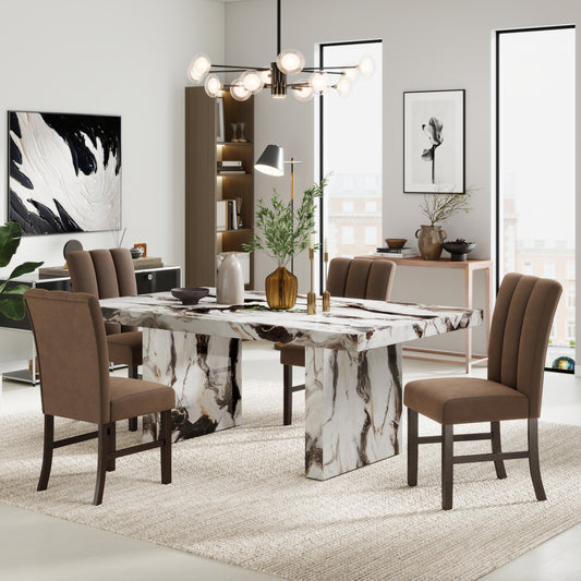Roundhill Furniture Cavira 5-Piece Modern Faux Marble Dining Set, Double Pedestal Table with 4 Upholstered Chairs