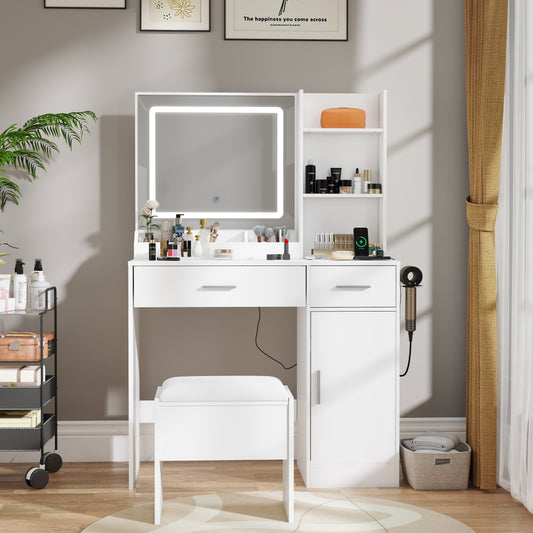 Roundhill Furniture Lavin Makeup Vanity Set, Vanity Desk with Stool, LED Light Mirror and Charging Station