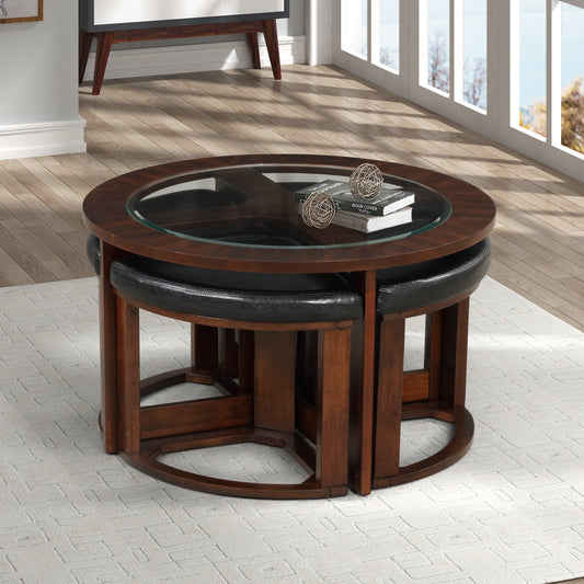 Solid Wood Glass Top Coffee Table w/ Stools