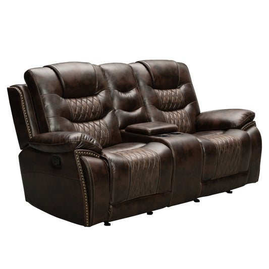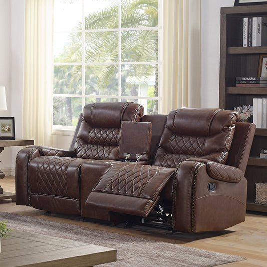 Achern Brown Leather Nailhead Air Reclining Loveseat with Storage Console