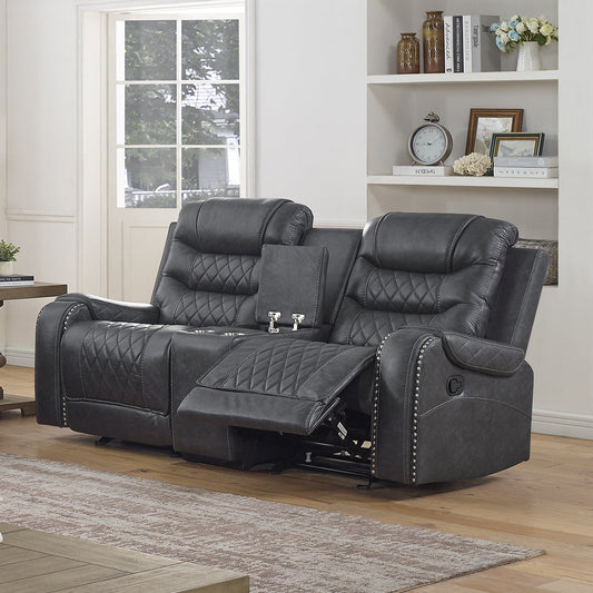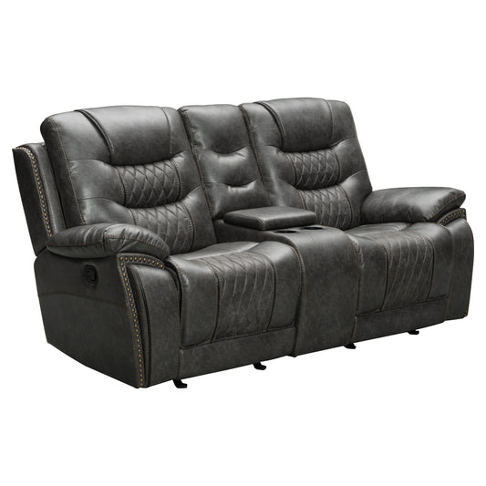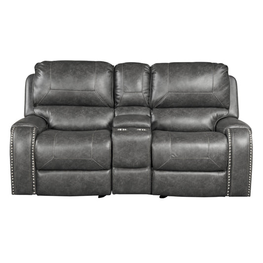 Achern Gray Leather-Air Nailhead Manual Reclining Loveseat with Storage Console