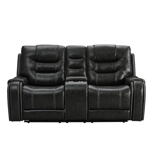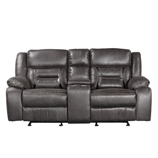 Kovel Faux Leather Reclining Loveseat with USB Port and Storage Console in Outlaw Steel