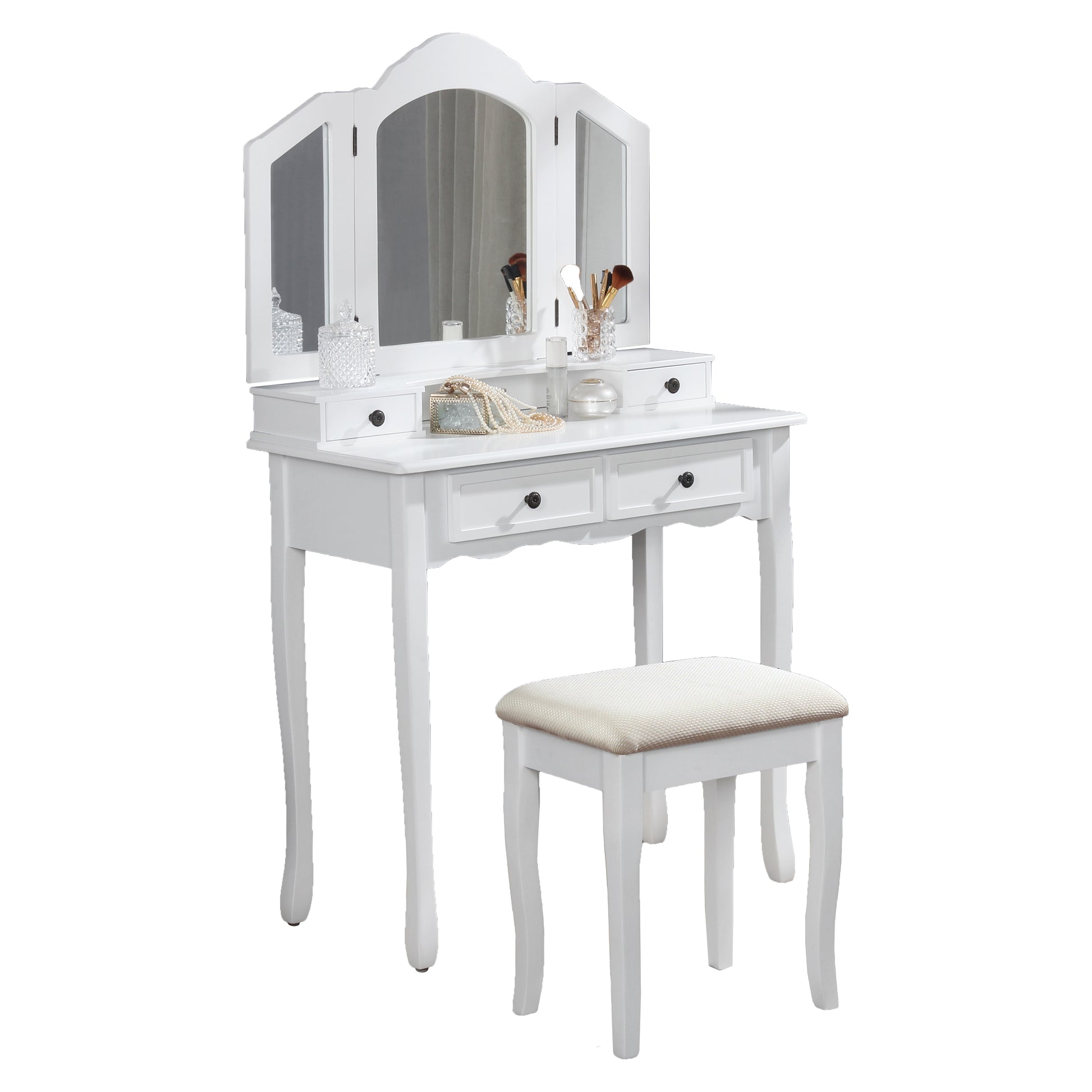 - Set includes a vanity, a 3-panel beveled mirror, and a thickly upholstered rectangular bench for comfort and style.