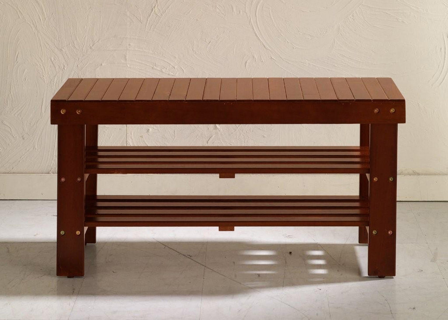 Enhance your entryway with the Roundhill Furniture Pina Solid Wood Shoe Storage Bench, a perfect blend of functionality and style. Crafted from quality solid wood with a rich cherry finish, this bench features two tiers of slatted shelves, providing ample storage for your footwear. Its sturdy build and sleek, compact design make it ideal for entryways, hallways, and mudrooms, offering both seating and storage in one.