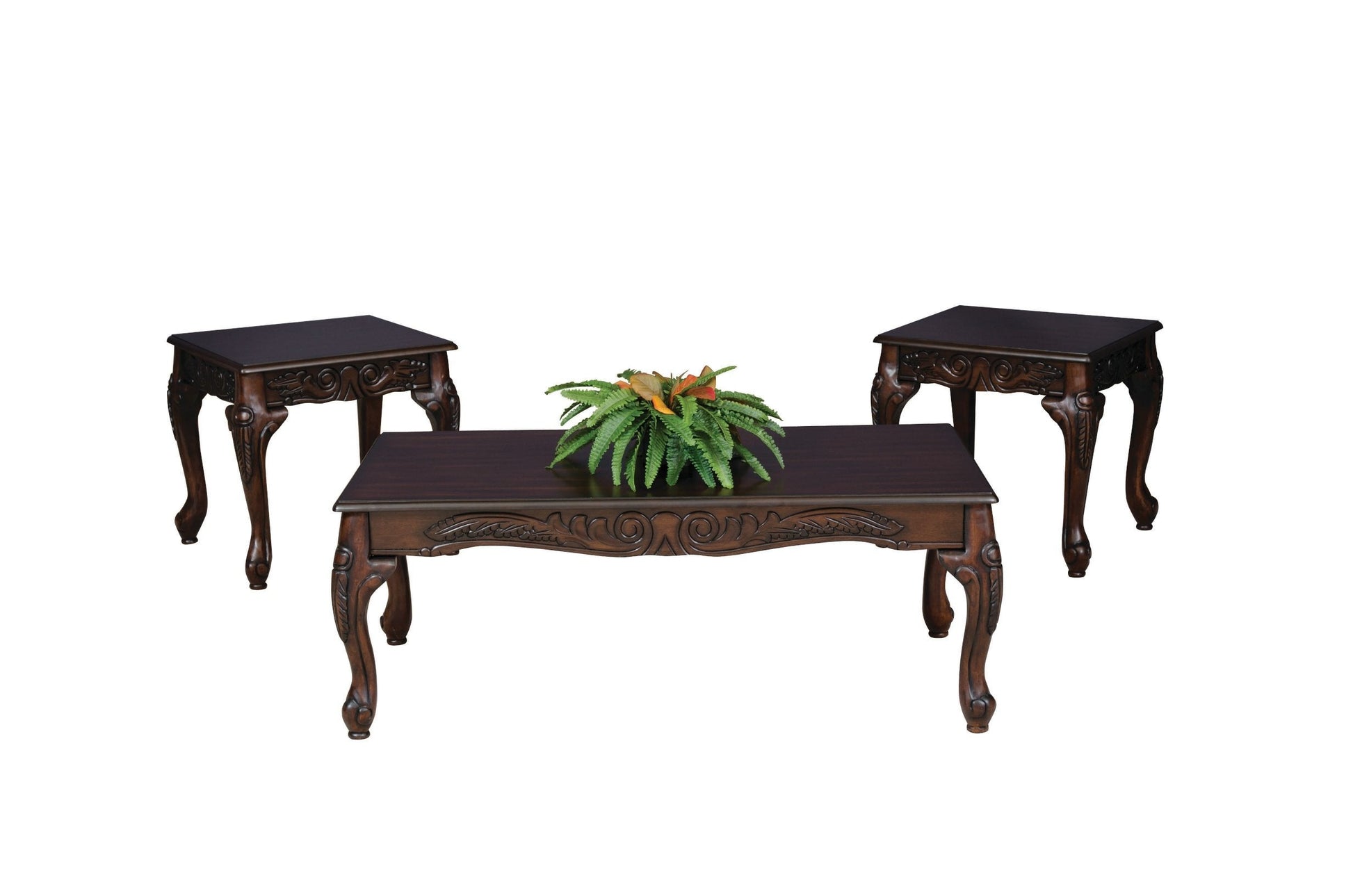 The classic-style table set is a beautiful combination of colors and design details that will bring warmth to any home. This sophisticated table set is covered in a dark cherry finish. The traditional details add elegance and grace to your living room.