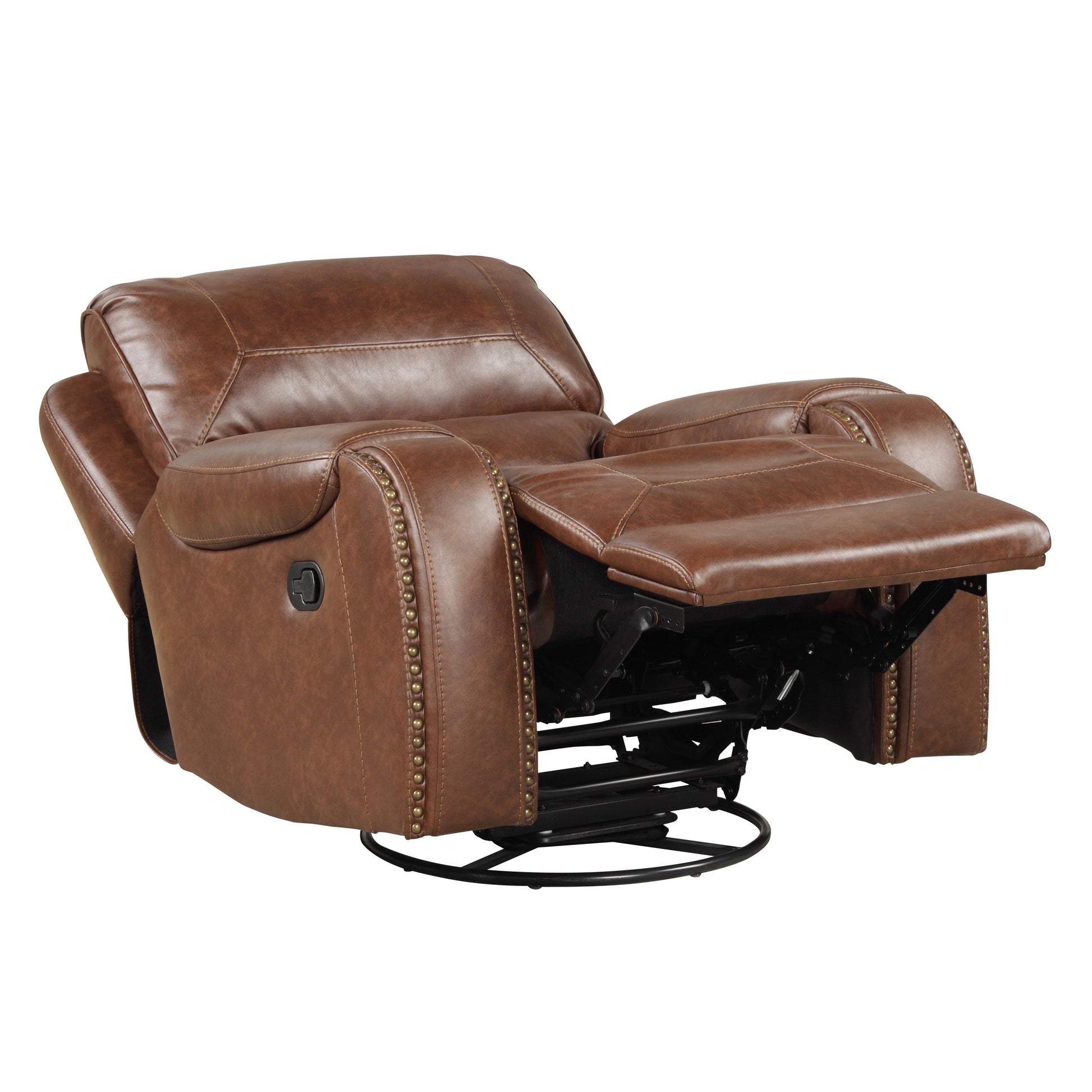 Increase the comfort level of your living room to its apex with the Achern Brown Leather Nailhead Air Reclining Living Room Collection. A warm, rich brown faux leather upholstery covers every inch and is accented with topstitched seams. Best of all, both sides of the spacious sofa gliding reclining system provide a cushiony footrest. Simply reach below the arm and pull gently on the lever, and you'll be ready for a well-deserved nap! And if that wasn't enough, the loveseat also includes a center storage console with two metal cup holders.