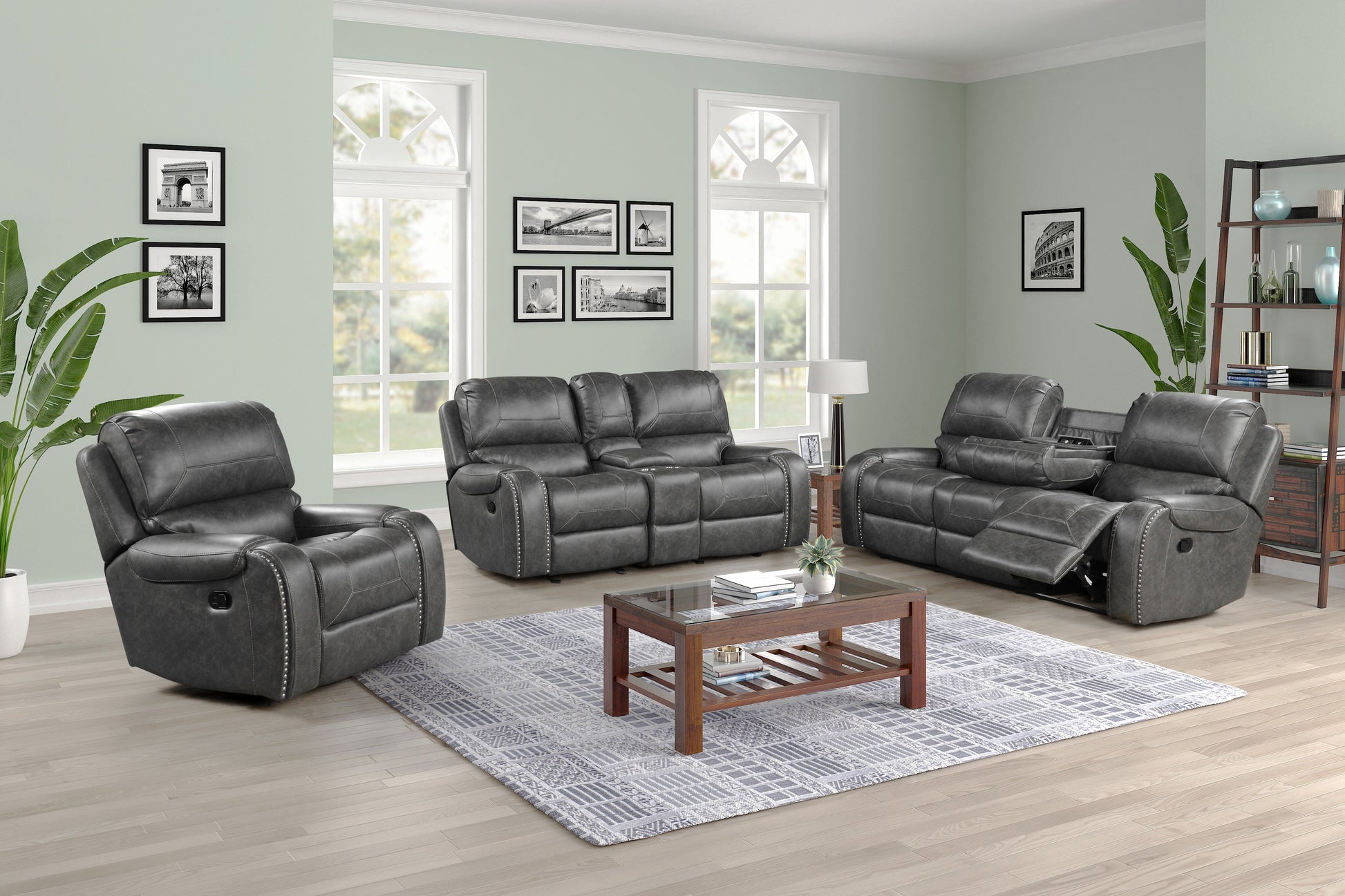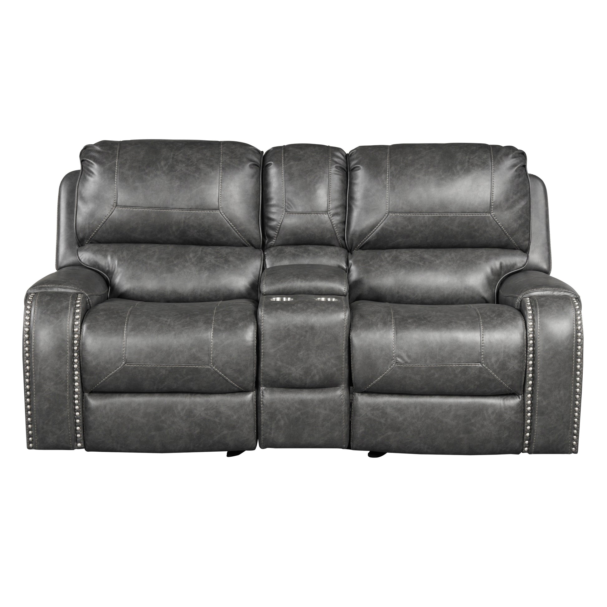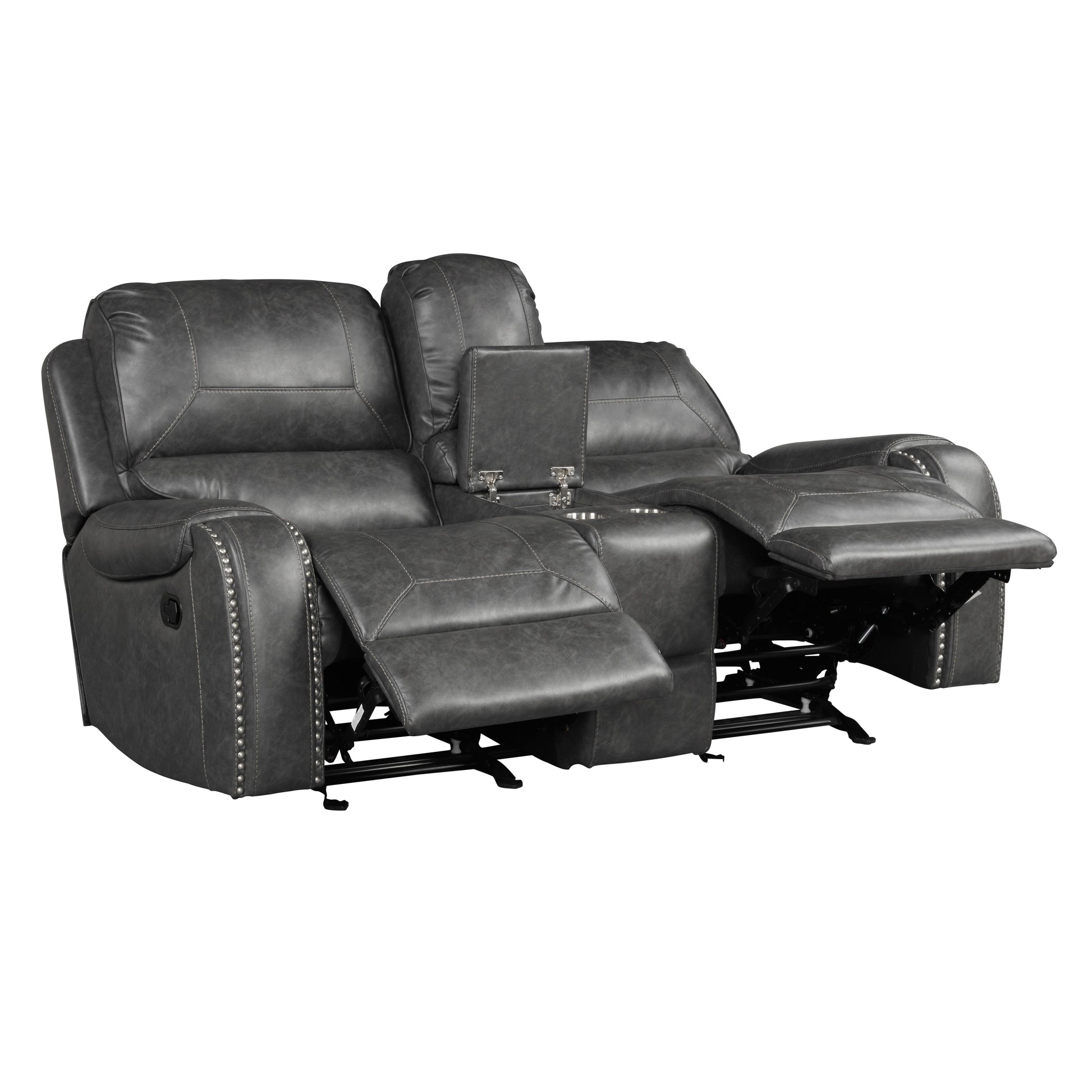Increase the comfort level of your living room to its apex with the Achern Gray Leather Nailhead Air Reclining Living Room Collection. Gray faux leather upholstery covers every inch and is accented with topstitched seams. Best of all, both sides of the spacious sofa gliding reclining system provide a cushiony footrest. Simply reach below the arm and pull gently on the lever, and you'll be ready for a well-deserved nap! And if that wasn't enough, the loveseat also includes a center storage console with two metal cup holders. Some assembly is required.