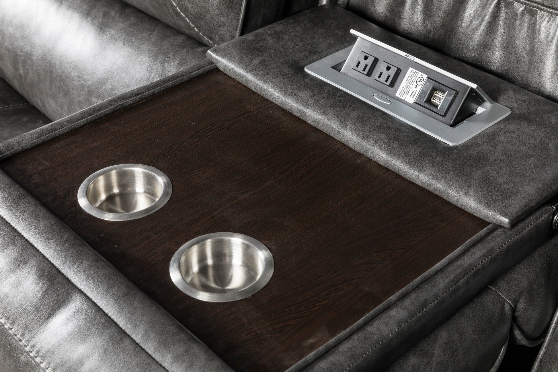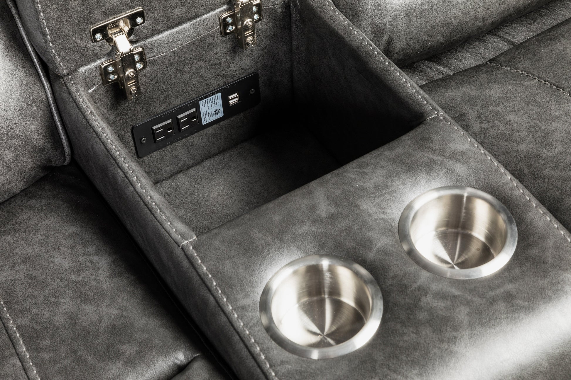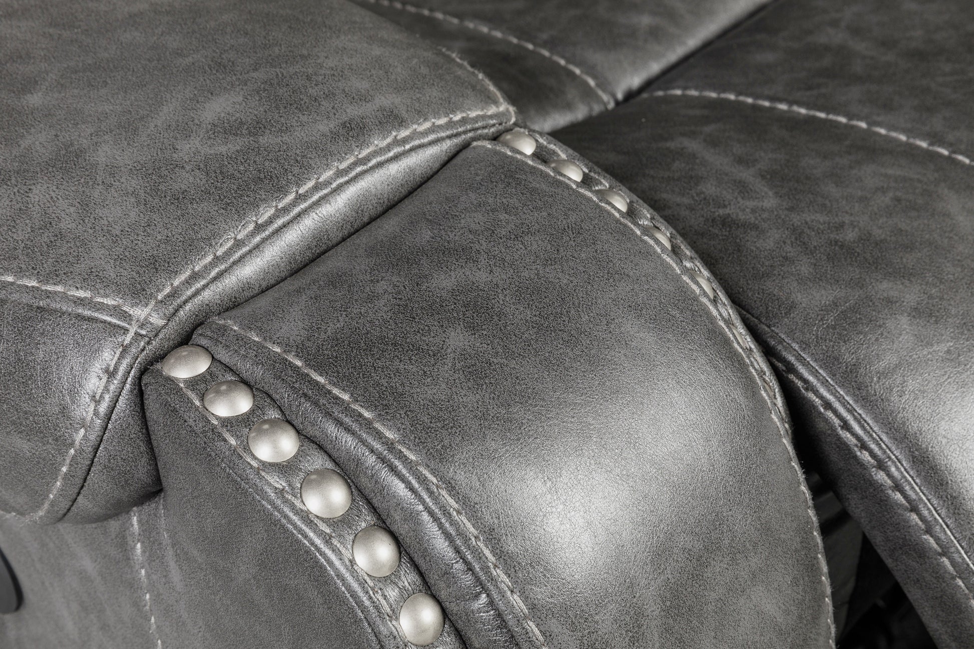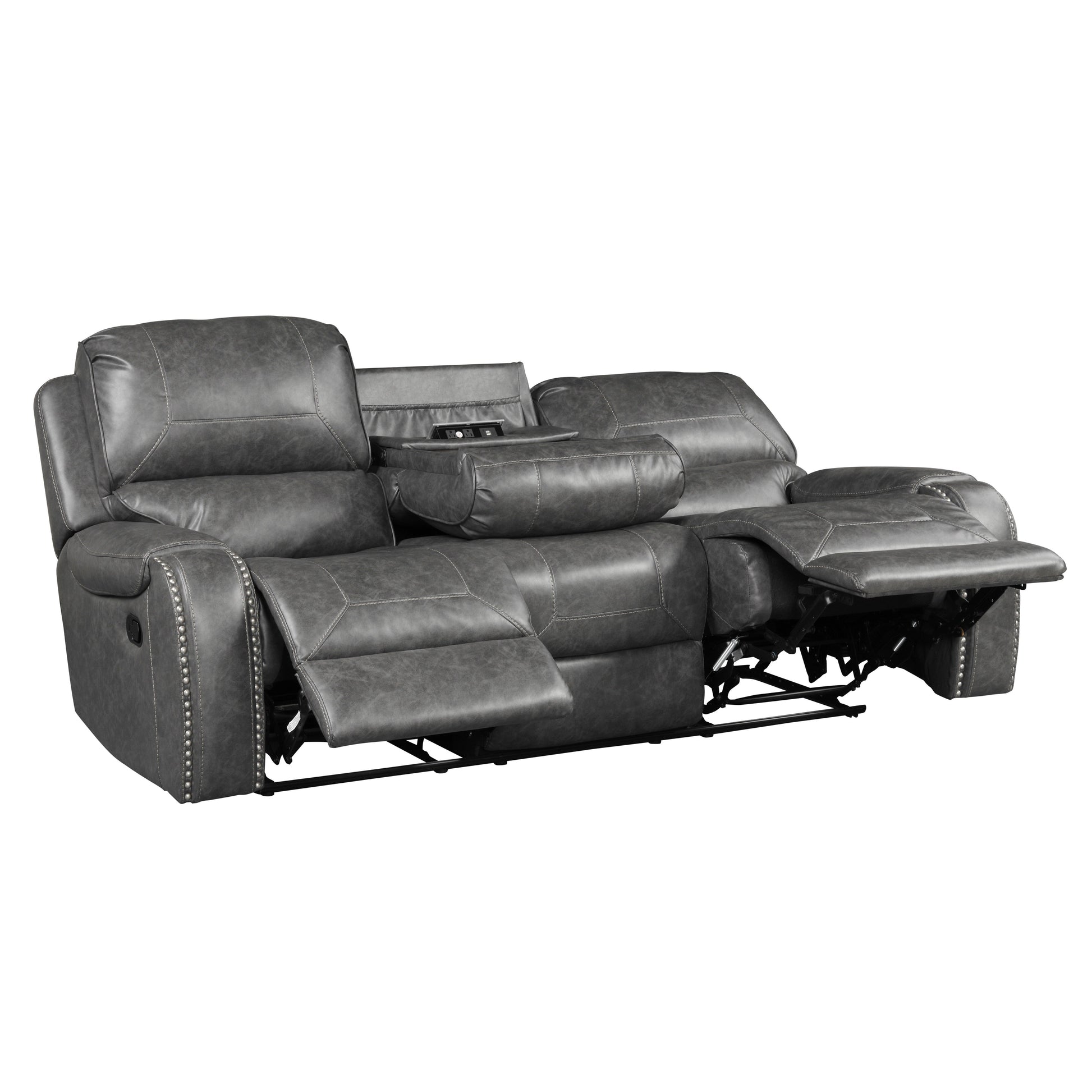 Increase the comfort level of your living room to its apex with the Achern Gray Leather Nailhead Air Reclining Living Room Collection. Gray faux leather upholstery covers every inch and is accented with topstitched seams. Best of all, both sides of the spacious sofa gliding reclining system provide a cushiony footrest. Simply reach below the arm and pull gently on the lever, and you'll be ready for a well-deserved nap! And if that wasn't enough, the loveseat also includes a center storage console with two metal cup holders. Some assembly is required.