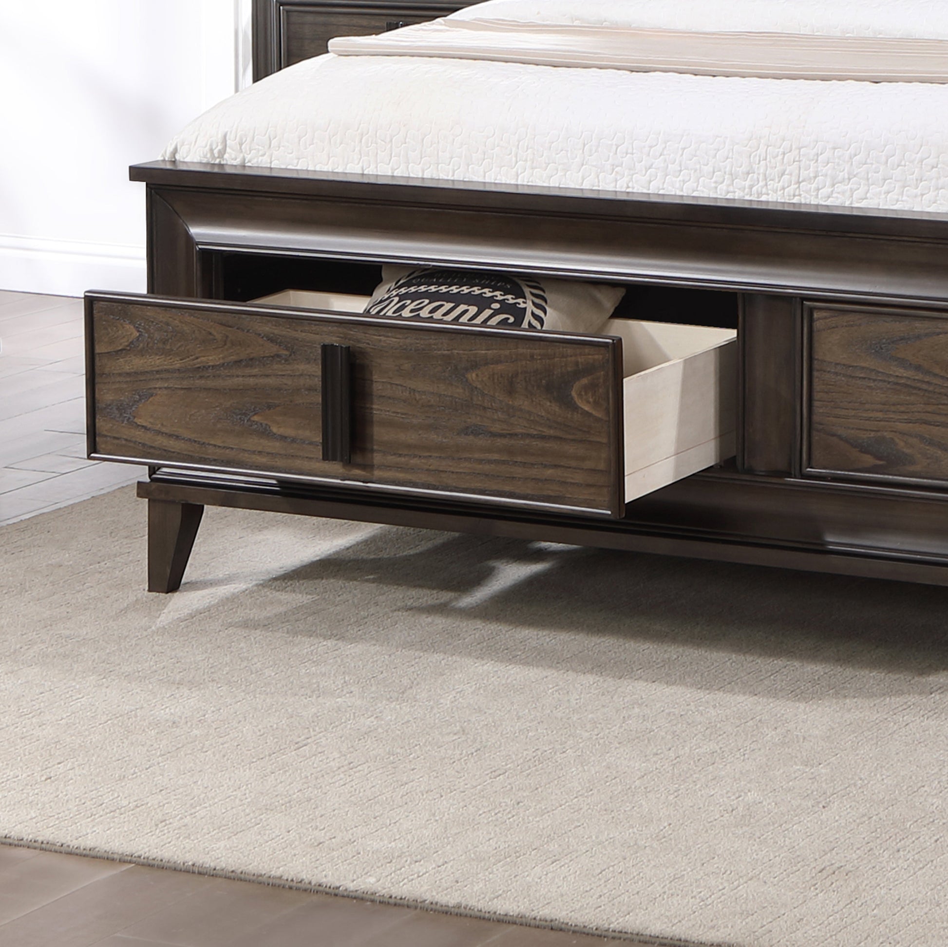 One of the standout designs of this bed is its luxurious upholstered panel headboard, providing not only a comfortable place to lean against but also adding a touch of opulence to your sleeping space. Featuring ultra-stylish wood construction and highlighting two convenient storage drawers in the footboard, these spacious drawers provide ample space to stow away extra linens, blankets, pillows, or any other items you wish to keep close at hand but out of sight. The dark brown finish combined with natural wood grain is a tasteful choice that effortlessly complements any existing bedroom decor.