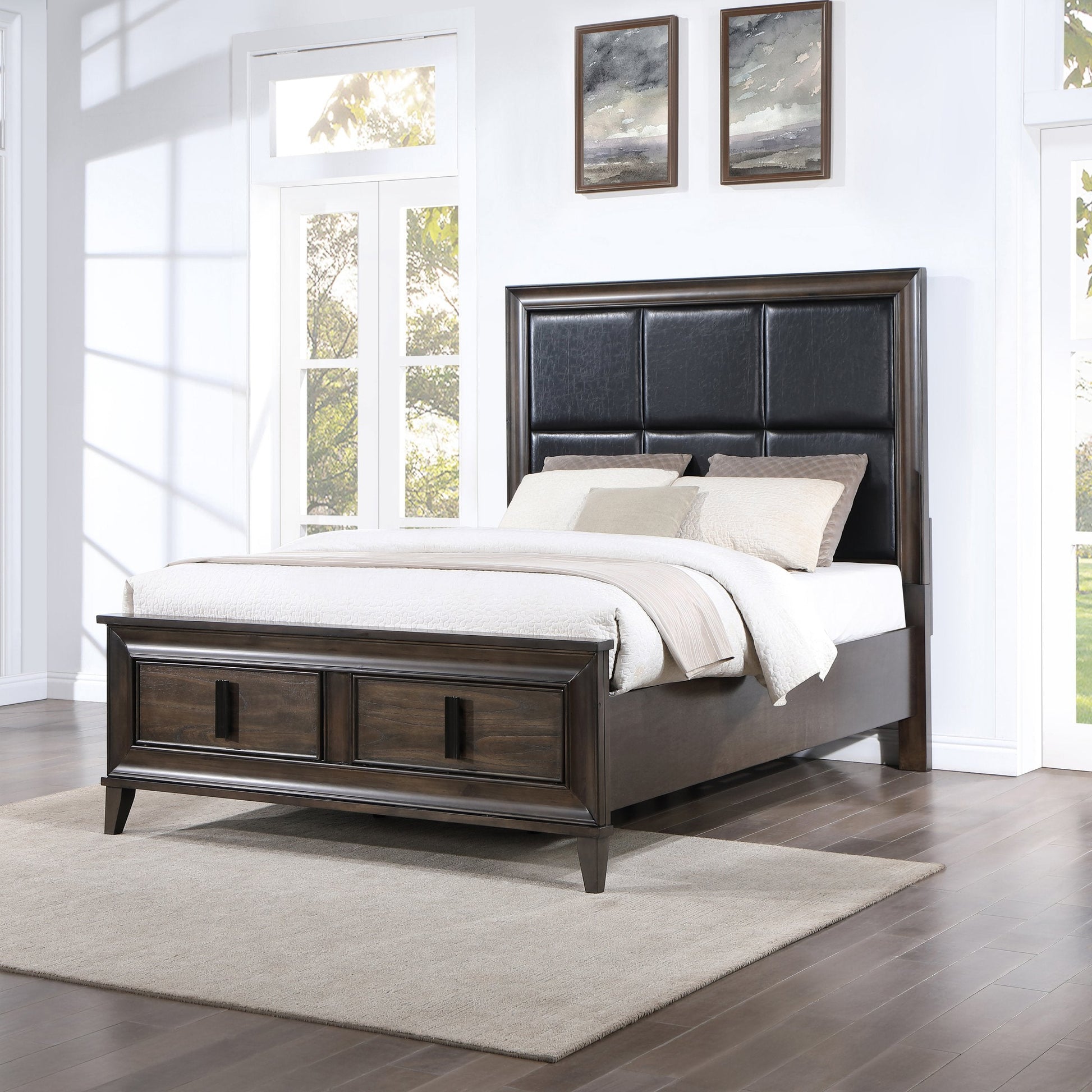 - FEATURES: The headboard boasts luxurious black upholstered panels, while the footboard impresses with two convenient storage drawers, combining style and practicality seamlessly. Providing ample space for storing extra linens, blankets, and pillows, keeps your bedroom tidy and organized.