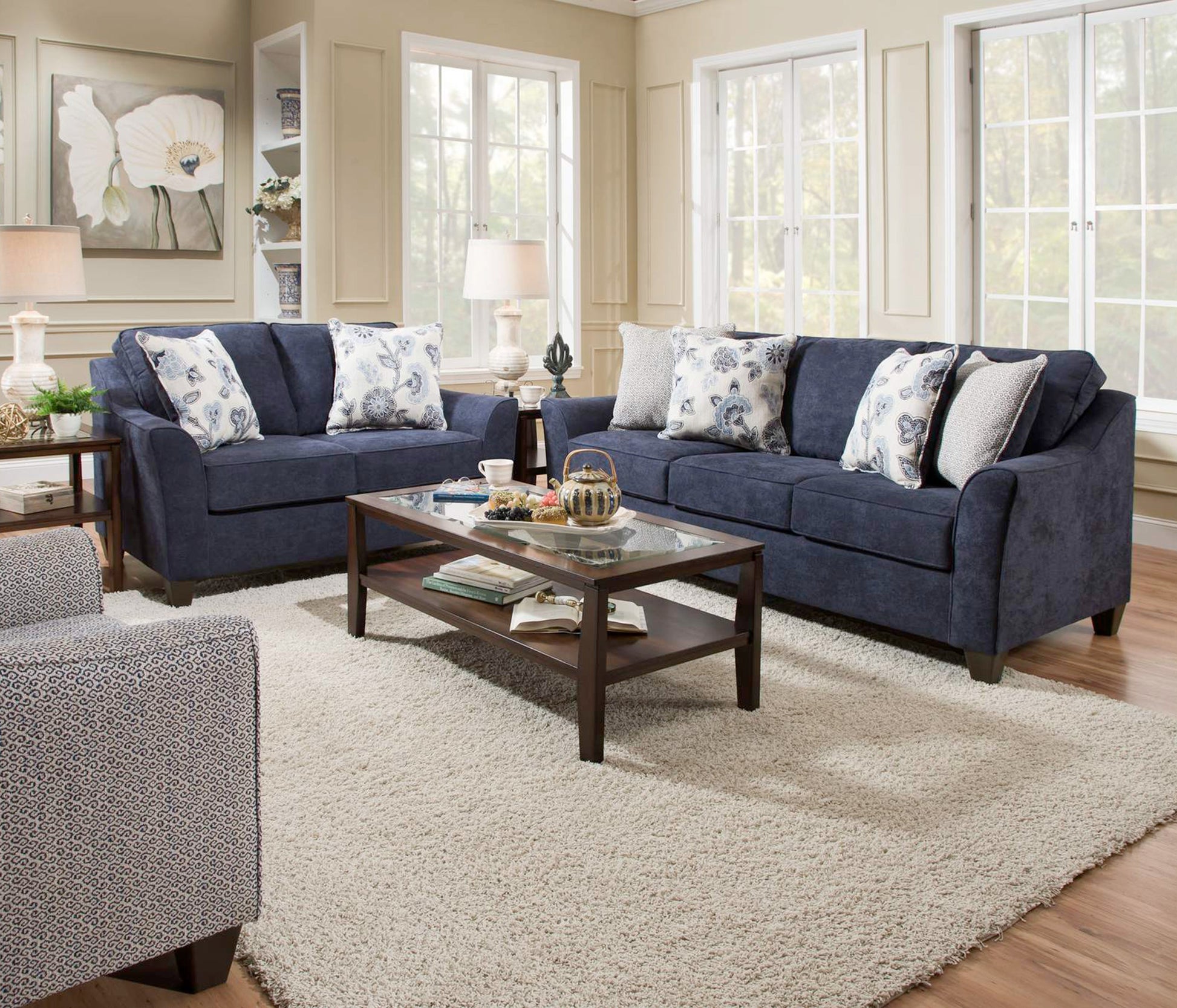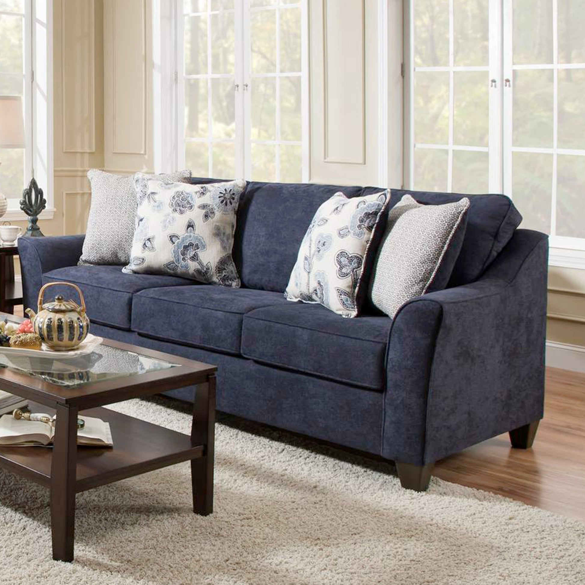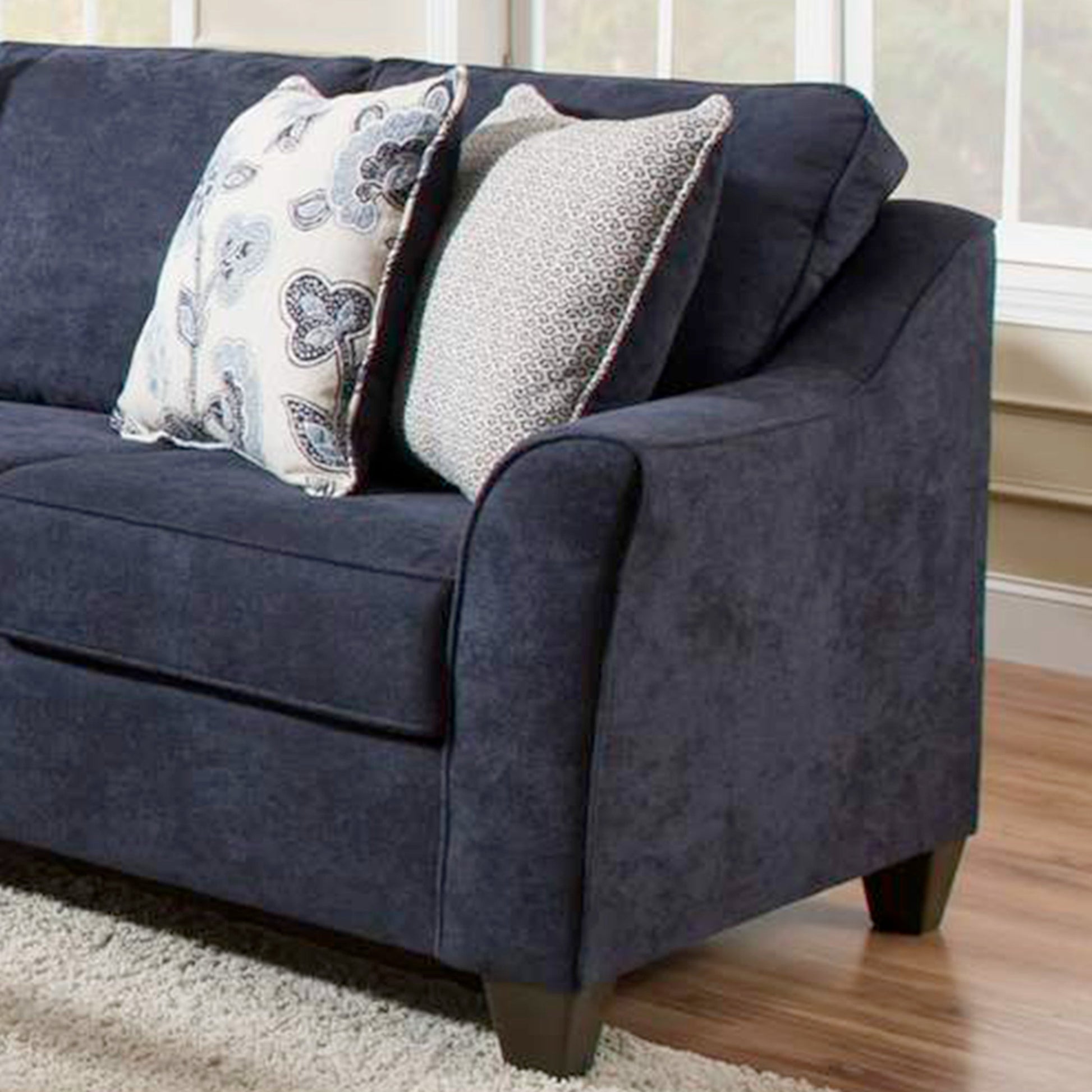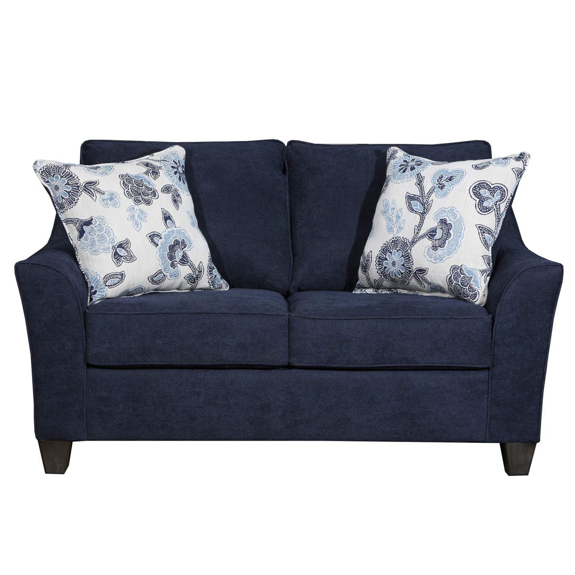 - The collection includes sofa and loveseat. The solid navy fabric is made to withstand wear and durable hardwood frame for long-lasting