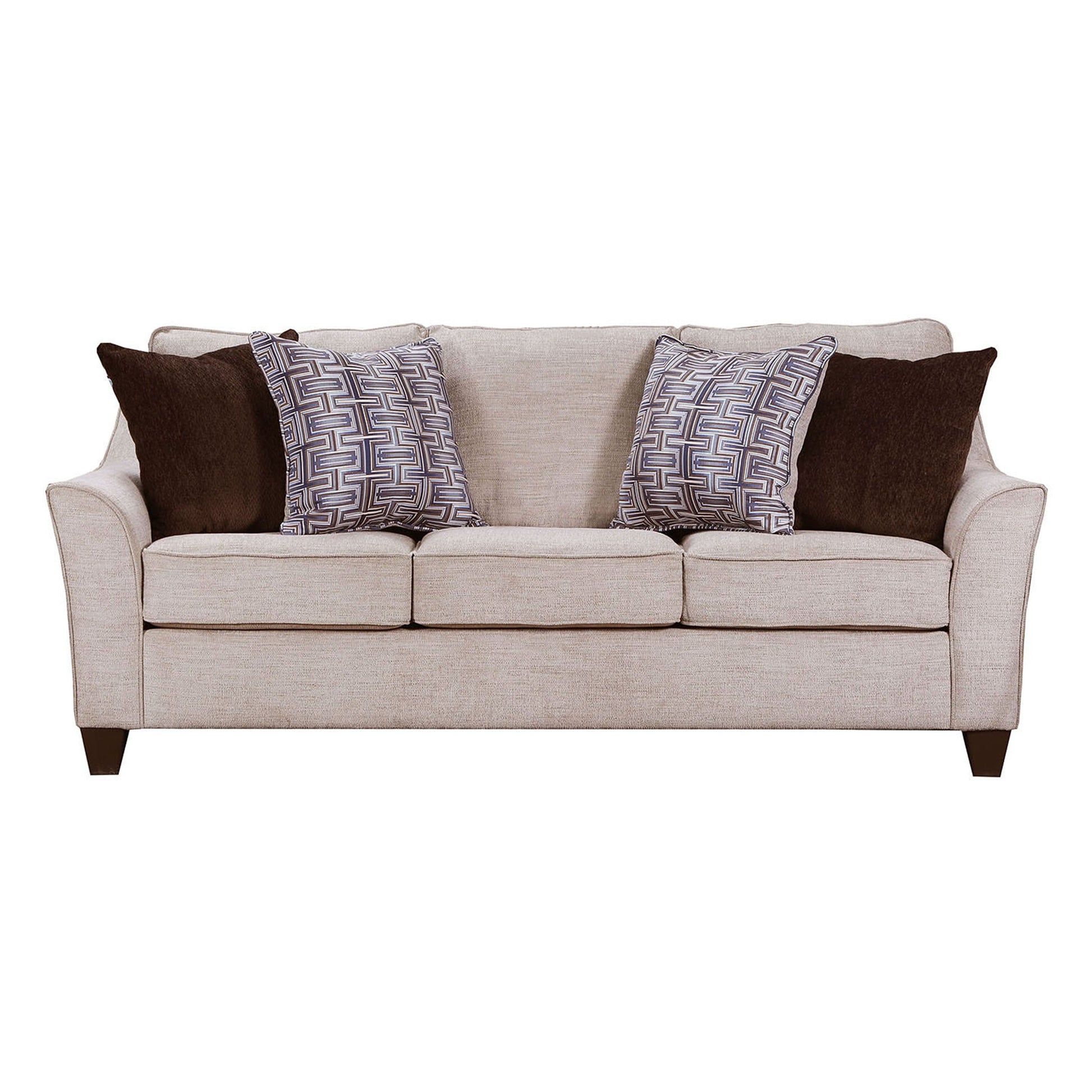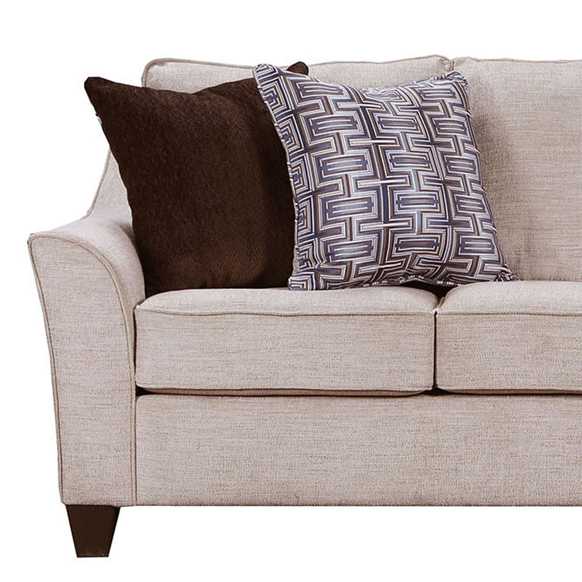 - Upholstered with soft chenille in taupe, the seat and back are thickly padded with high density and Dacron-wrapped foam. Two floral pattern accent pillows are included