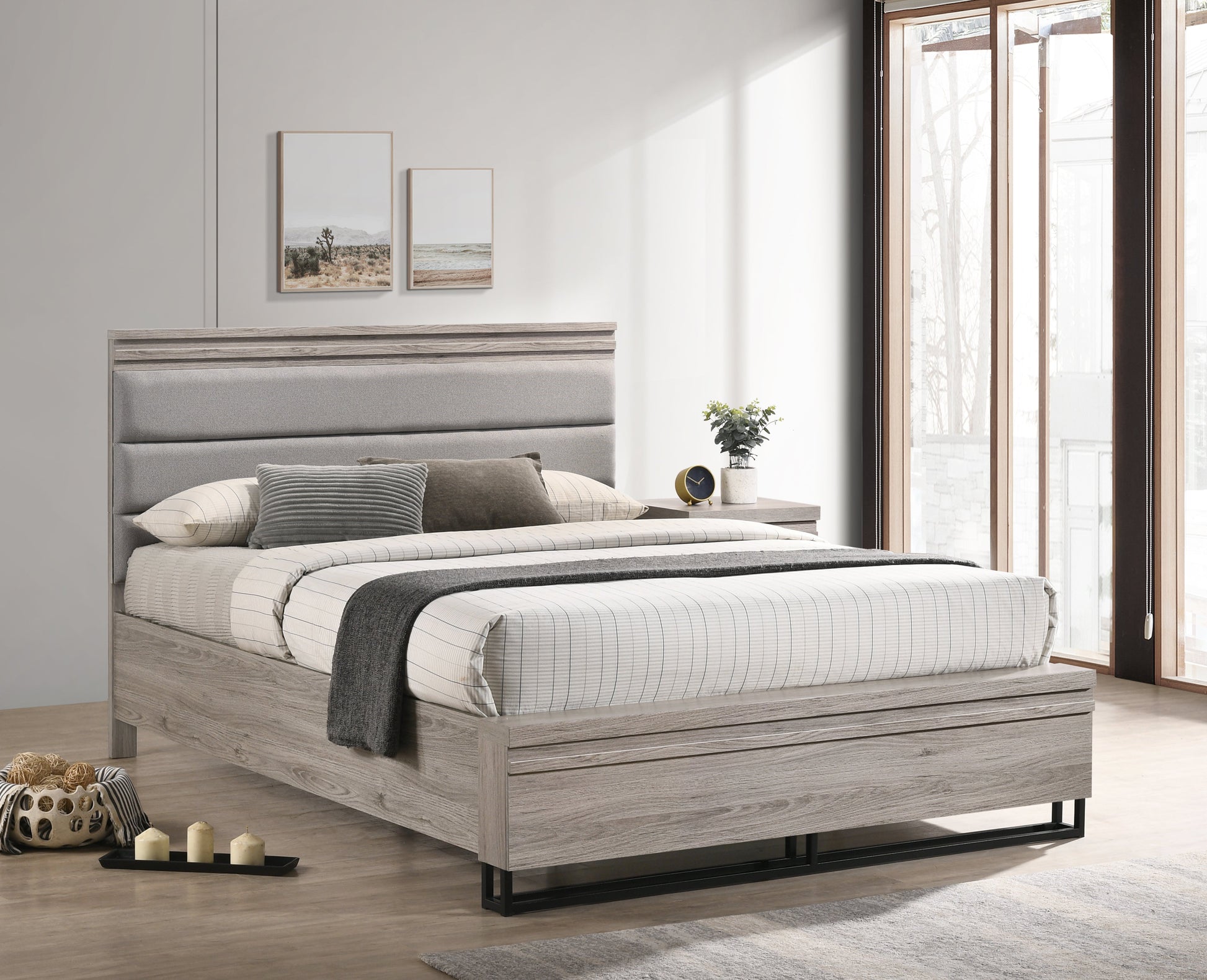 Alvear Upholstered Wood Panel Bed, Weathered Gray
