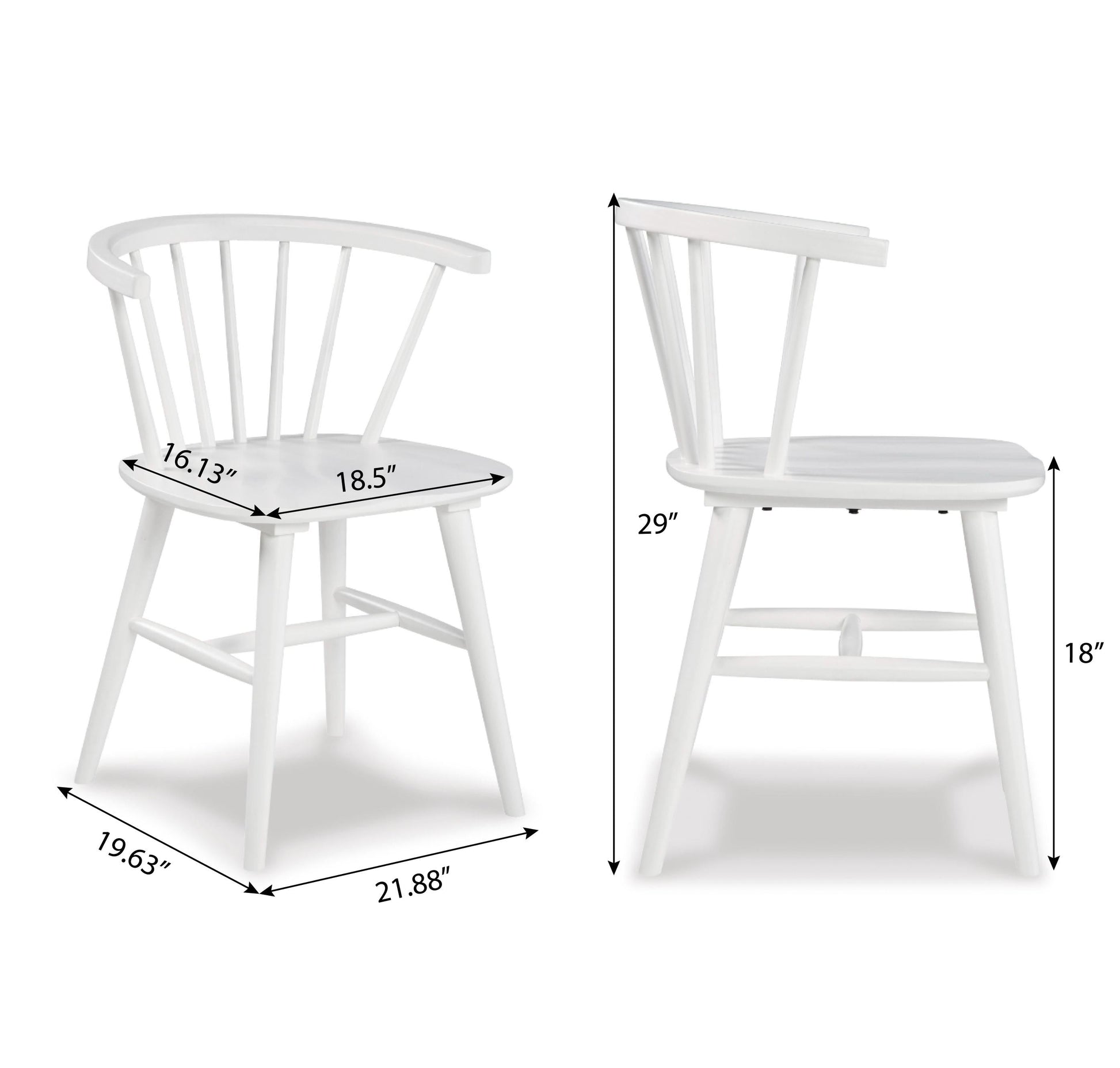 - Alwynn chairs feature a sleek white finish, low spindle back, and turned legs for modern elegance.