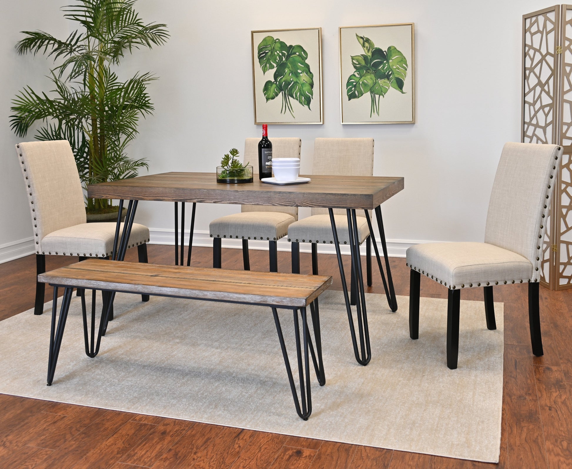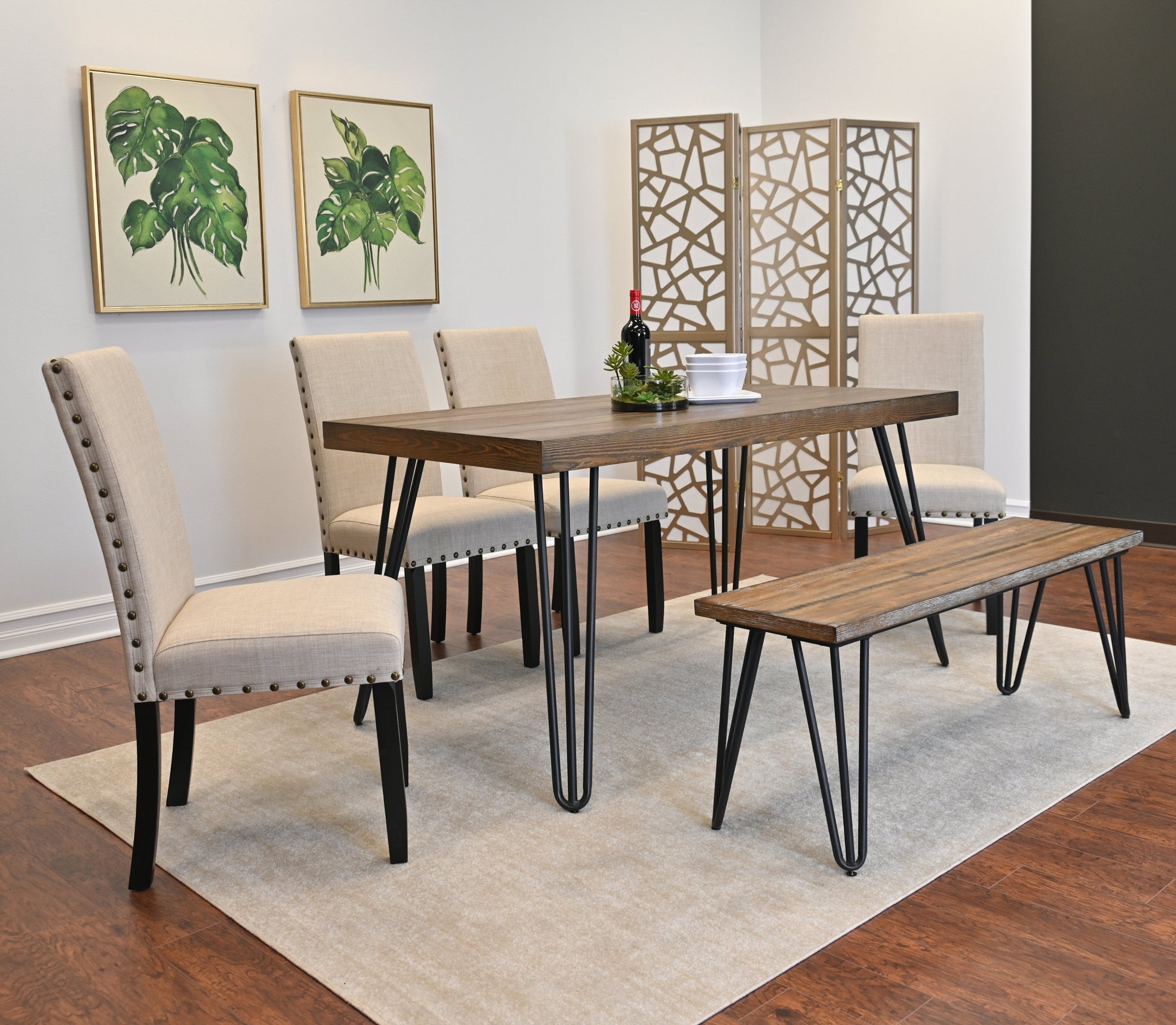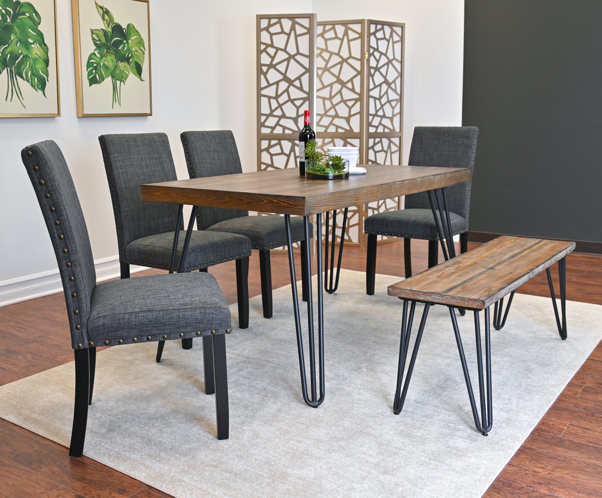 - HIGHLIGHTS: The dining table and bench feature a metallic hairpin design, which adds both stability and style. They have a rustic dark pine finish and showcase a natural wood grain texture, offering an elegant look. The chairs feature fabric upholstery with brass nailheads, adding texture and visual appeal.