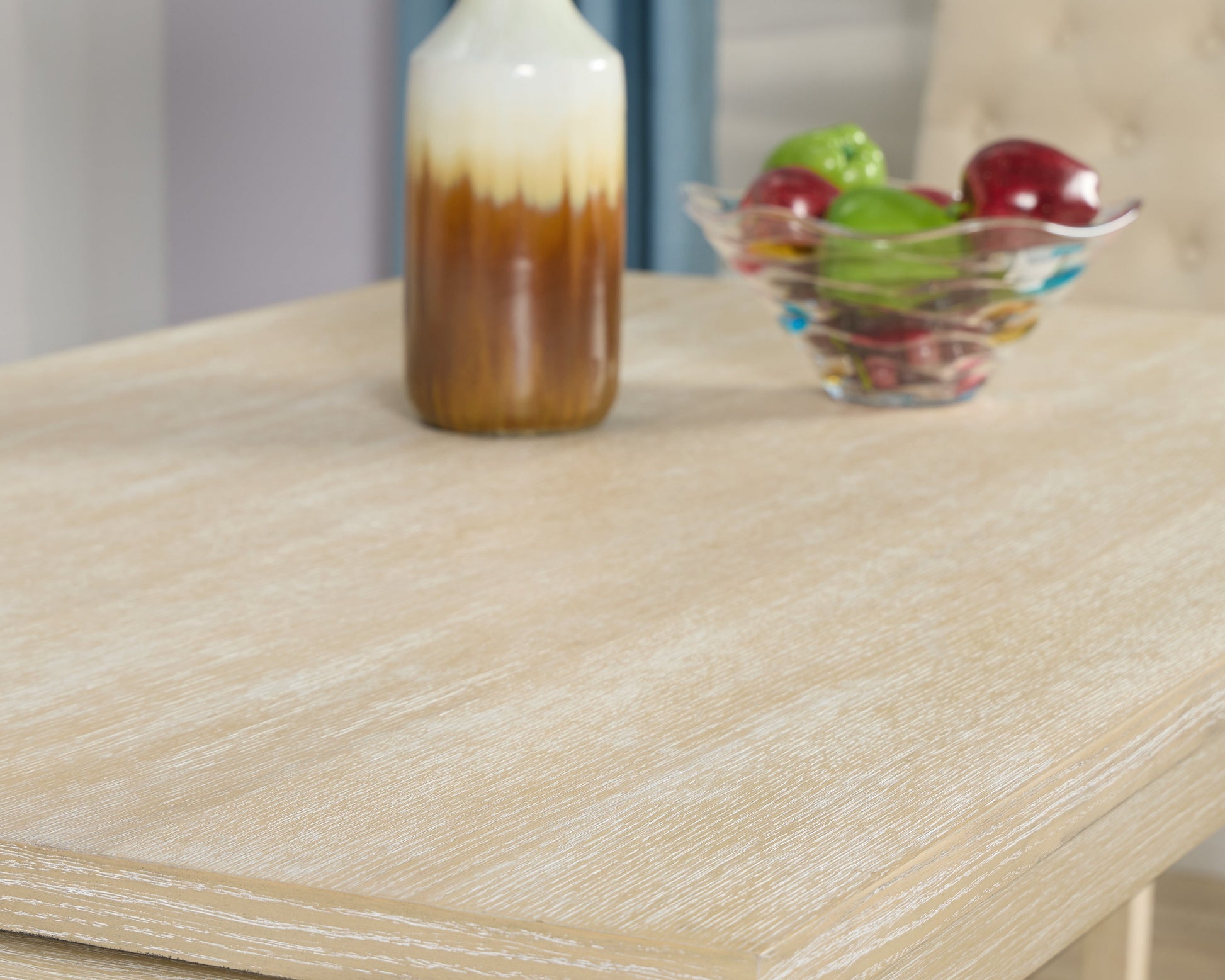 - HIGHLIGHTS: The dining table features a turned leg design, which adds both stability and style. It has a wired-white finish and showcases a natural wood grain texture, offering an elegant look. The chairs are designed with button-tufted details, providing a touch of sophistication. Chair legs are finished in an oak color that complements the table perfectly. Indulge in the allure of this exquisite dining set and elevate your home decor.