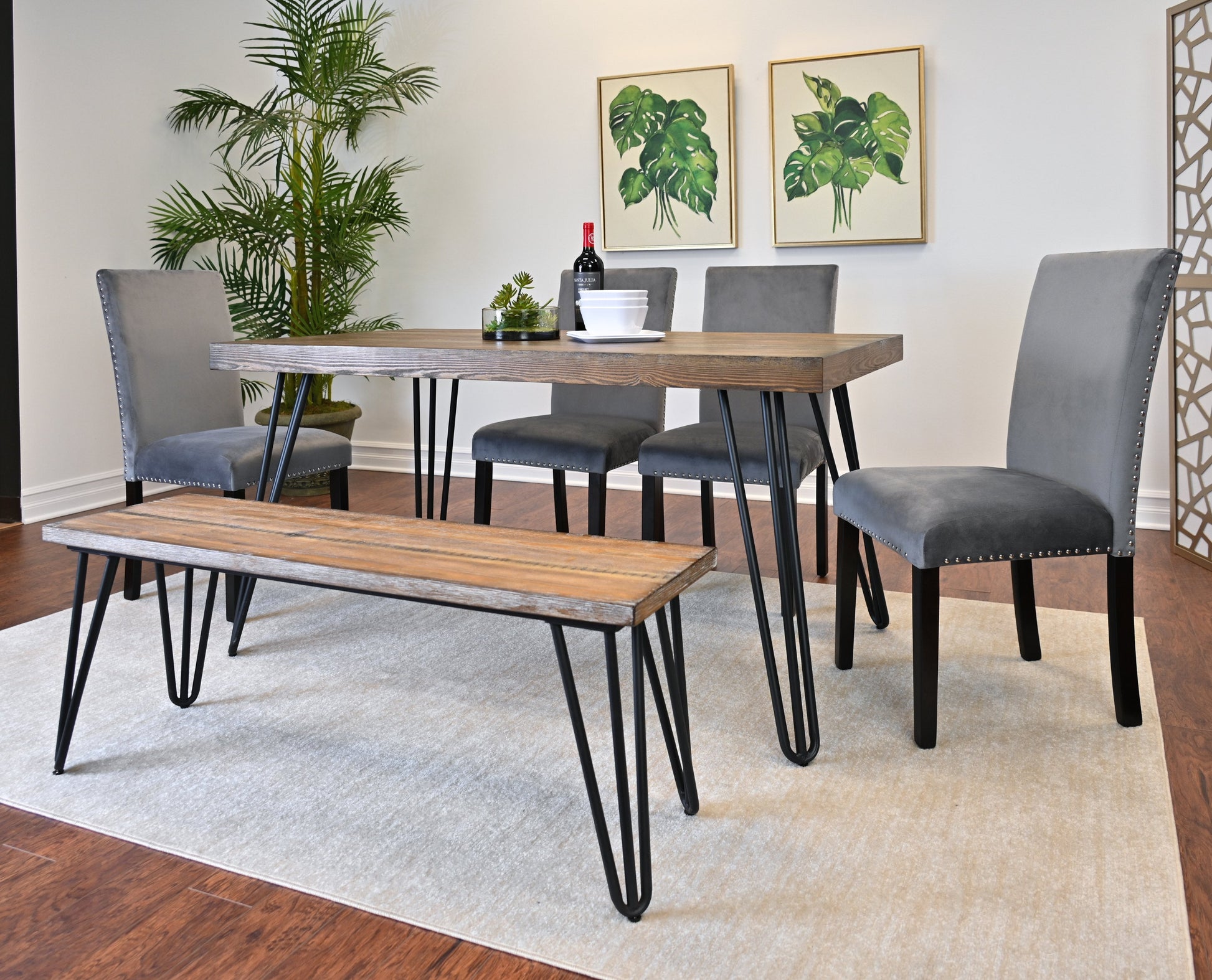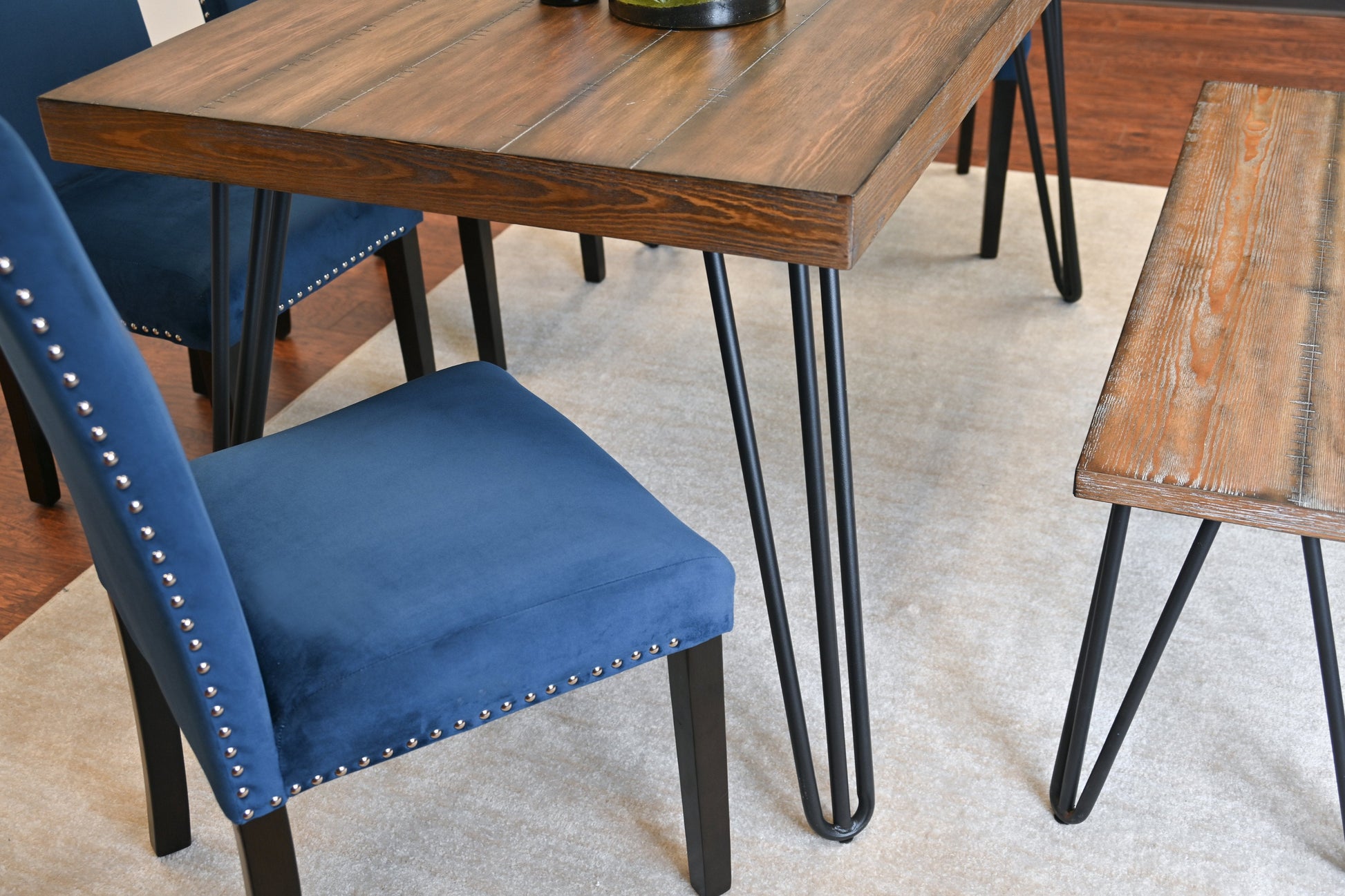 - HIGHLIGHTS: The dining table and bench feature a metallic hairpin design, which adds both stability and style. They have a rustic dark pine finish and showcases a natural wood grain texture, offering an elegant look. The chairs feature chrome nailhead accents that create a striking contrast against the velvet upholstery, enhancing the visual appeal.
