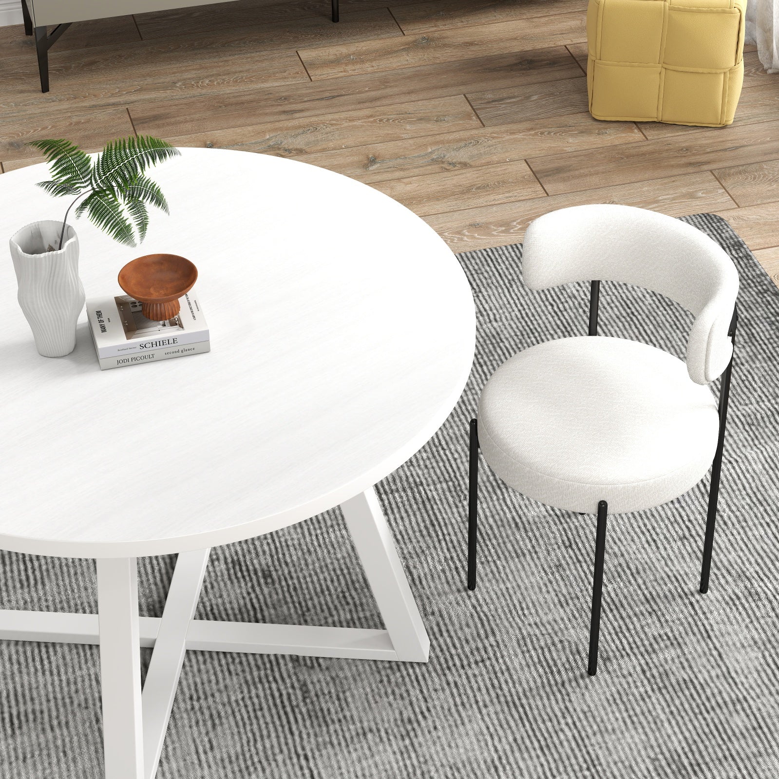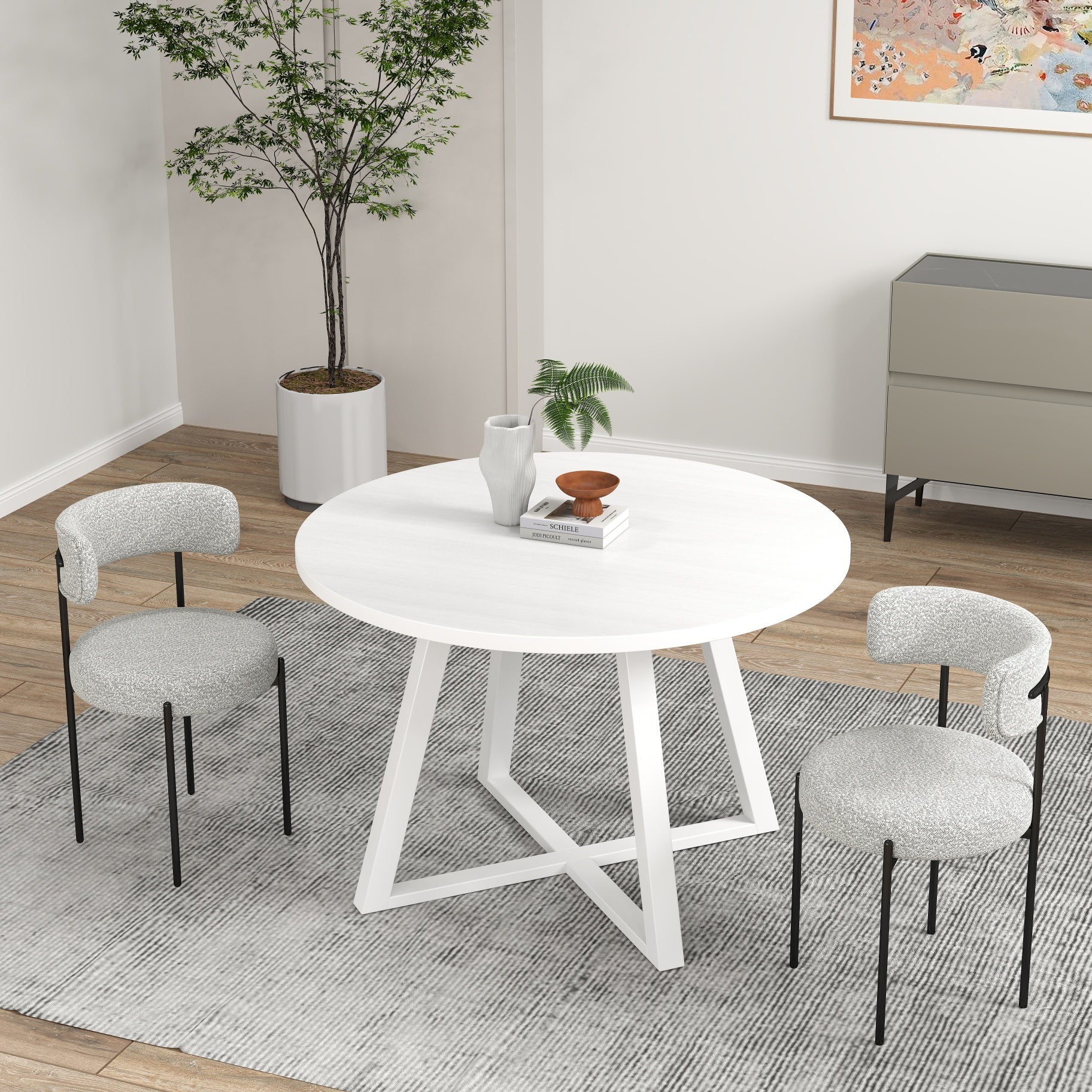 The dining table features clean lines with a minimalist, bright design. Its white-stylized trestle table base adds a touch of elegance, while the melamine tabletop ensures durability and minimalist appeal. Constructed with a Rubberwood base and a decorative laminate MDF top, this round table offers ample space for entertaining family and friends. The chairs, featuring robust iron legs and intricate stitching, are wrapped in rich Boucle fabric, providing embracing comfort that contours perfectly to your back. Don't miss the chance to enrich your home with the exquisite Roundhill Durban 3-piece dining set! It's available in two chair colors: White and Black White.