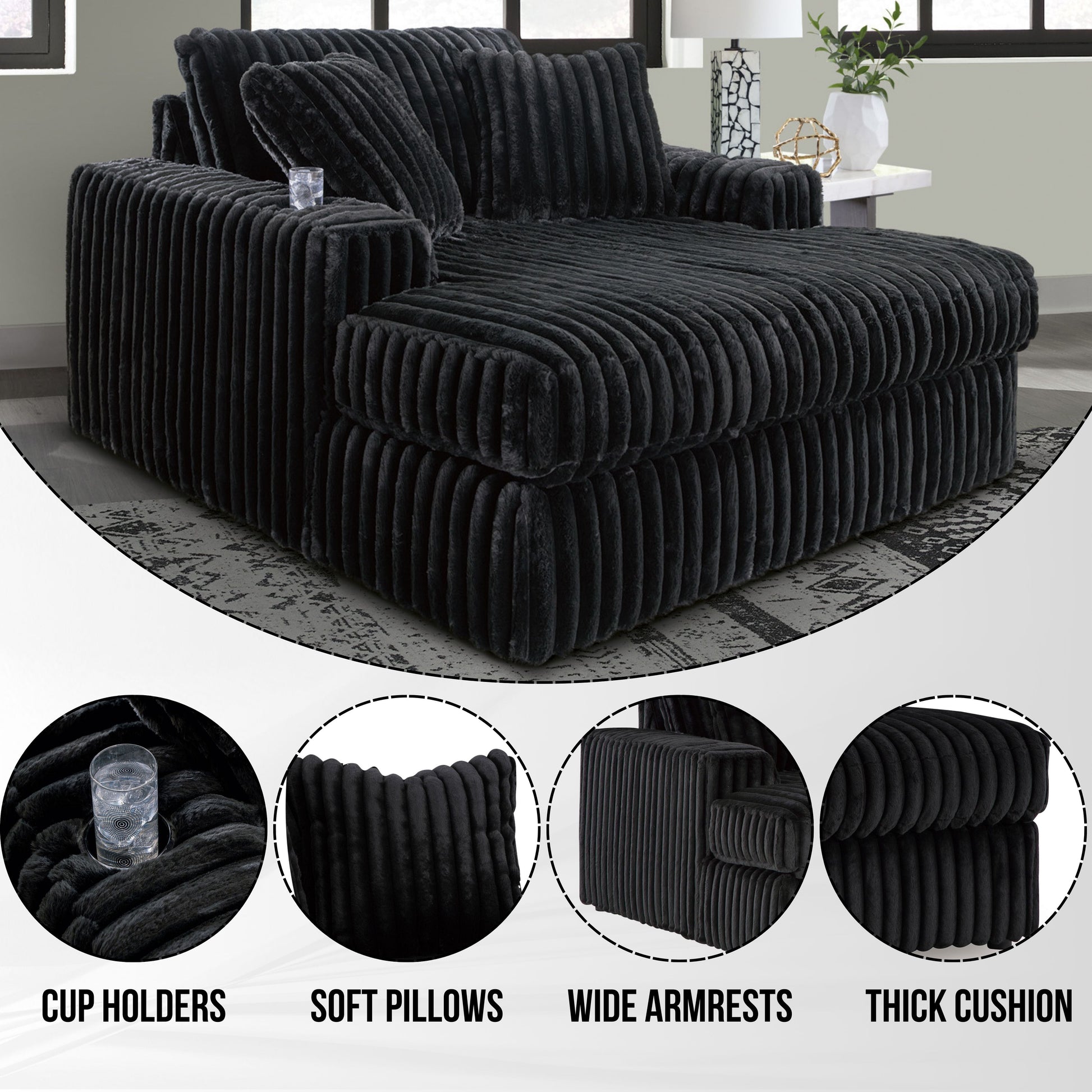 Azulu Upholstered Oversized Chaise, with Cup holders and USB Charging