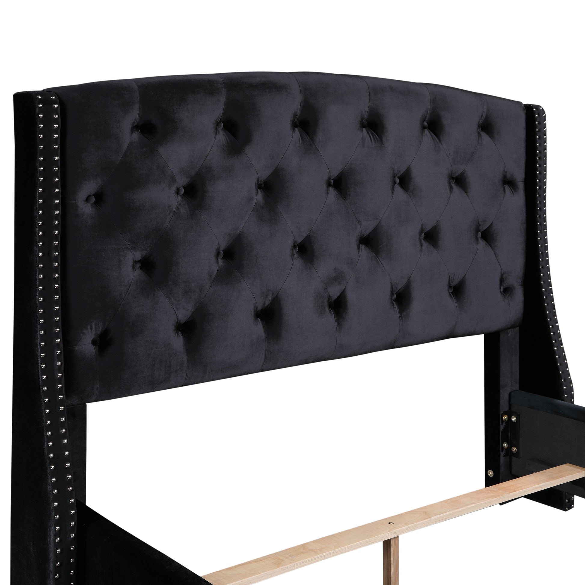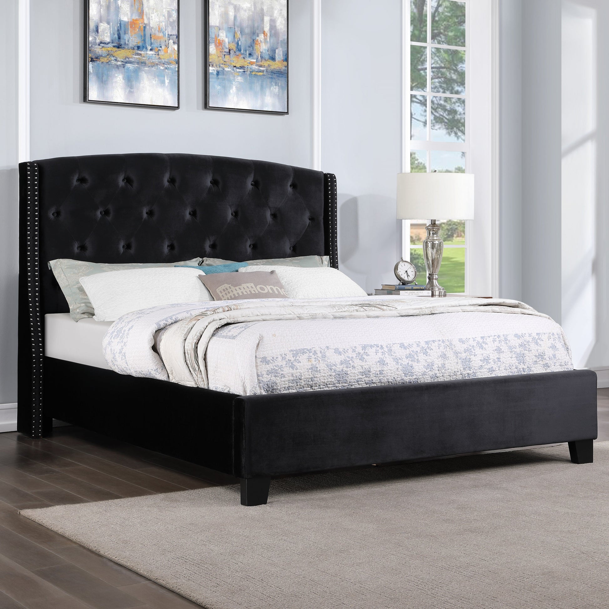 - The headboard features soft velvet upholstery in black color, with nailhead trim along the edge to elevate the look