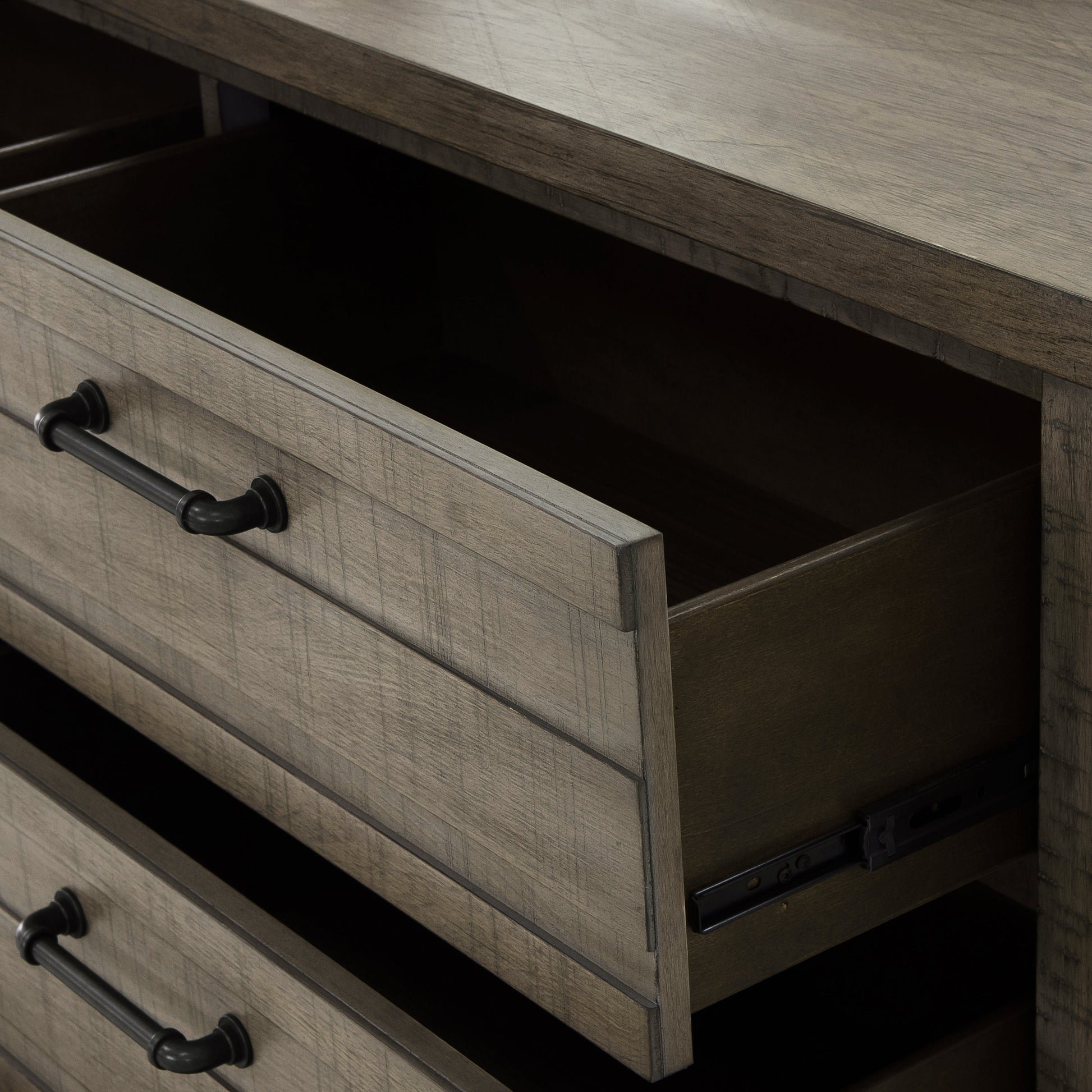 - The medium distressed gray finish on birch veneers and poplar solids compliments the black industrial drawer pulls nicely
