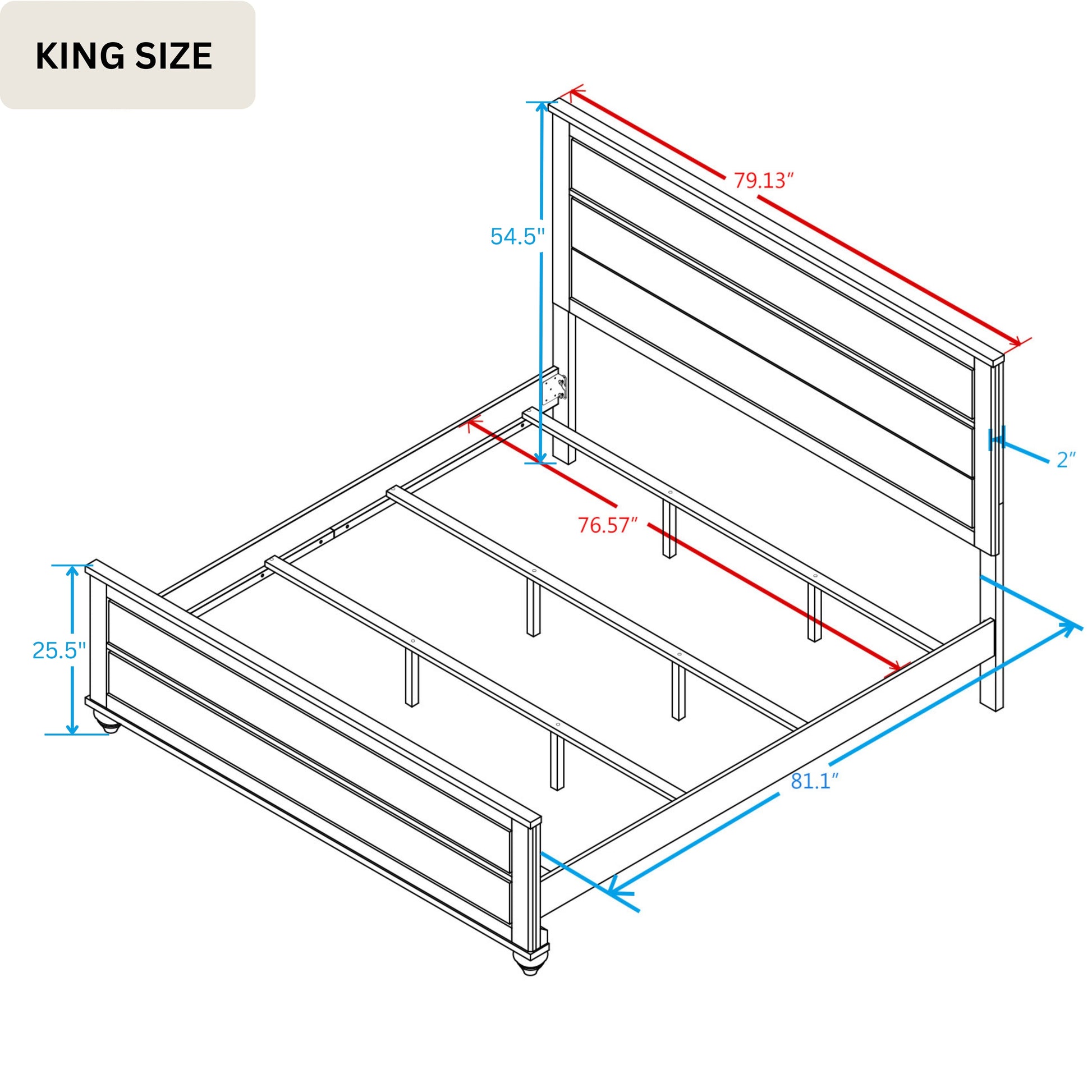 King bed set up dimension: 79.13"W x 85.13"D x 54.5"H. King head board: 79.13"W x 2"D x 54.5"H; Foot board: 79.13"W x 2"D x 25.5"H; Side rails: 81.13"W x 0.75"D x 5.5"H