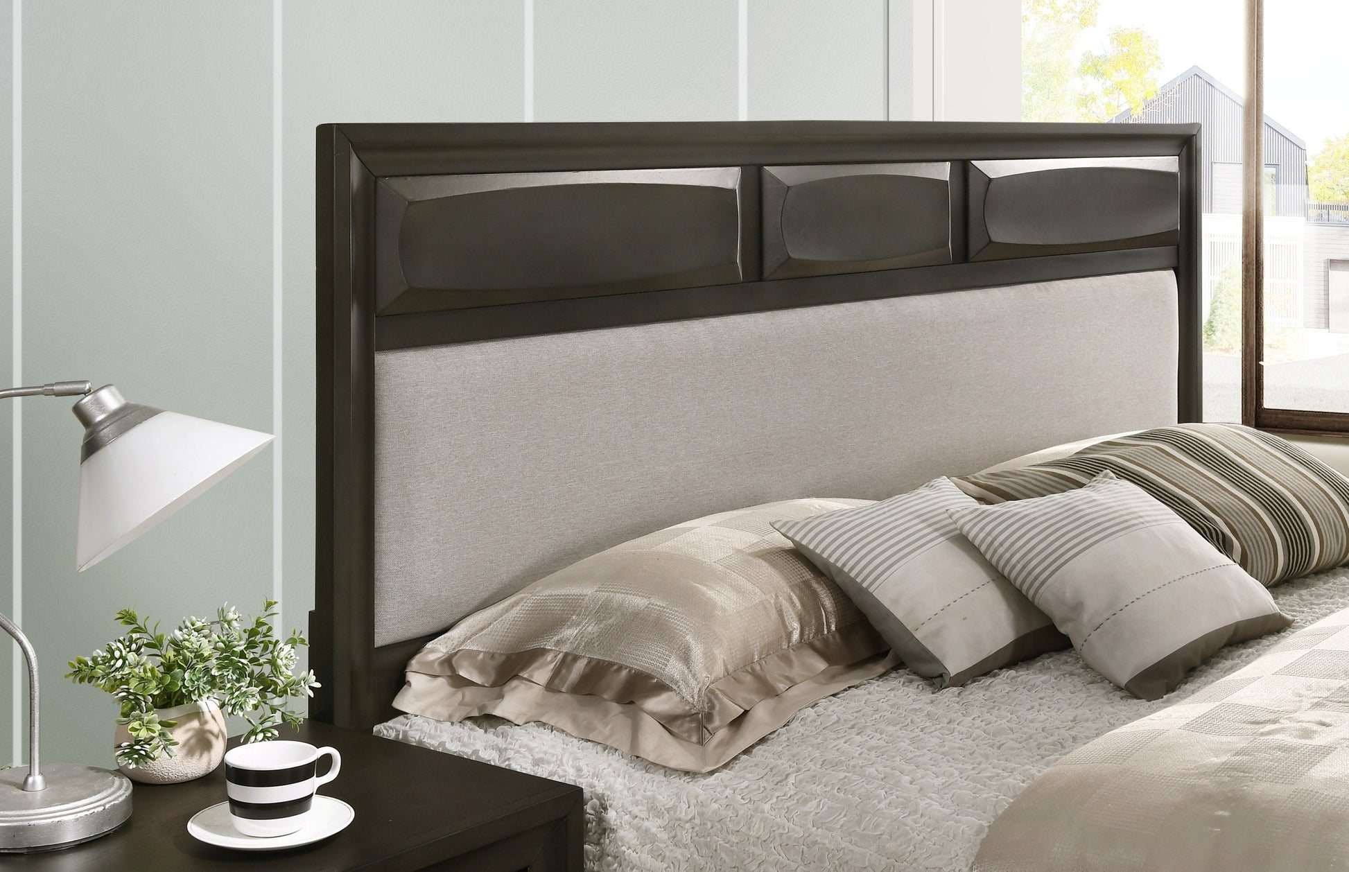 - The headboard features nude fabric upholstery to add comfort, contrasting with the antique gray finish perfectly