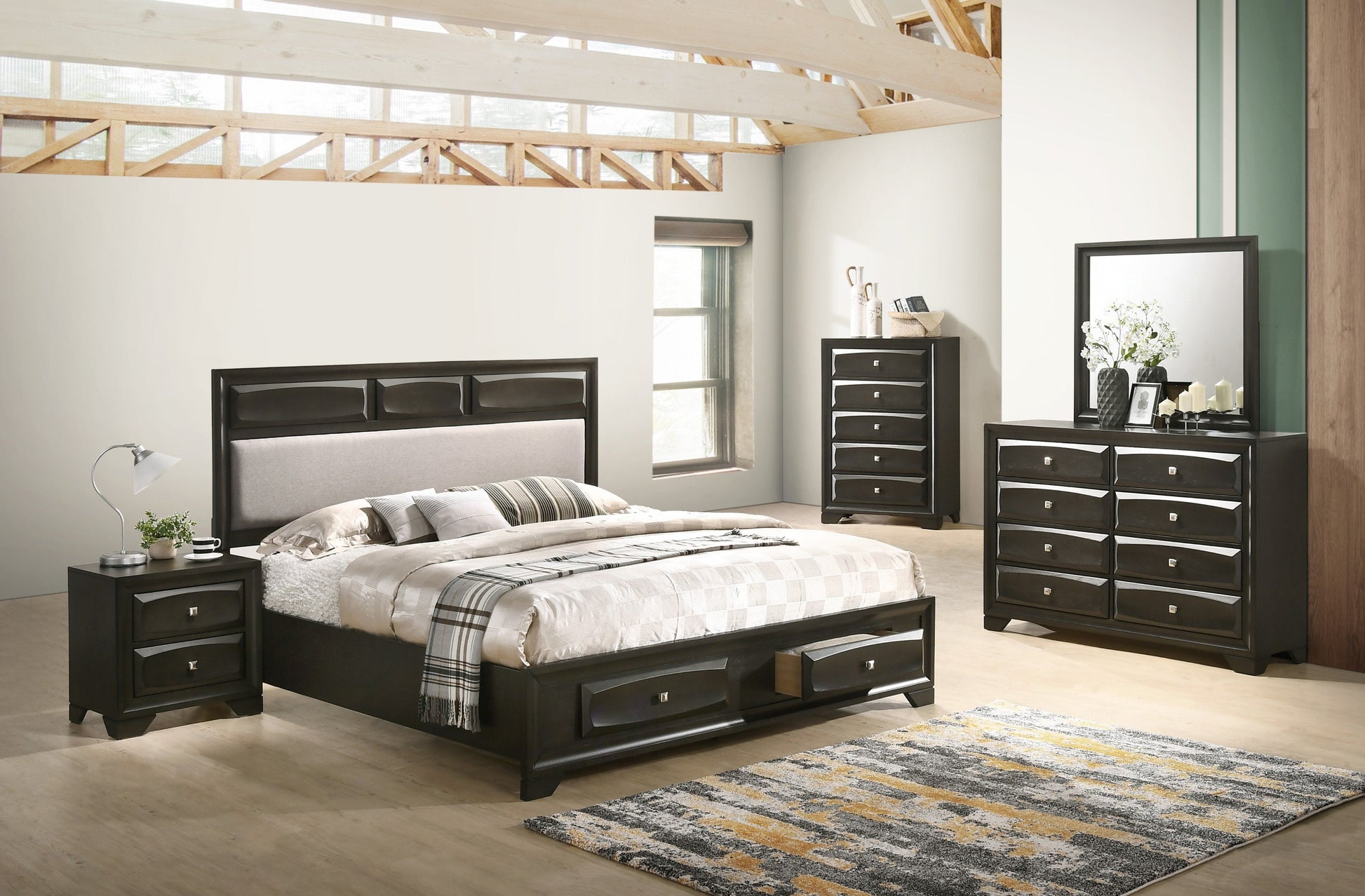 Indulge yourself in the luxury of the Oakland bedroom collection by Roundhill Furniture. Designed with elegant and detailed hand-crafted pieces, this storage bed is constructed of solid hardwoods and covered with a rich antique gray finish. All drawers feature beveled edges for a unique and refined appearance that is complemented. The bed features two drawers for easy, under-bed storage.