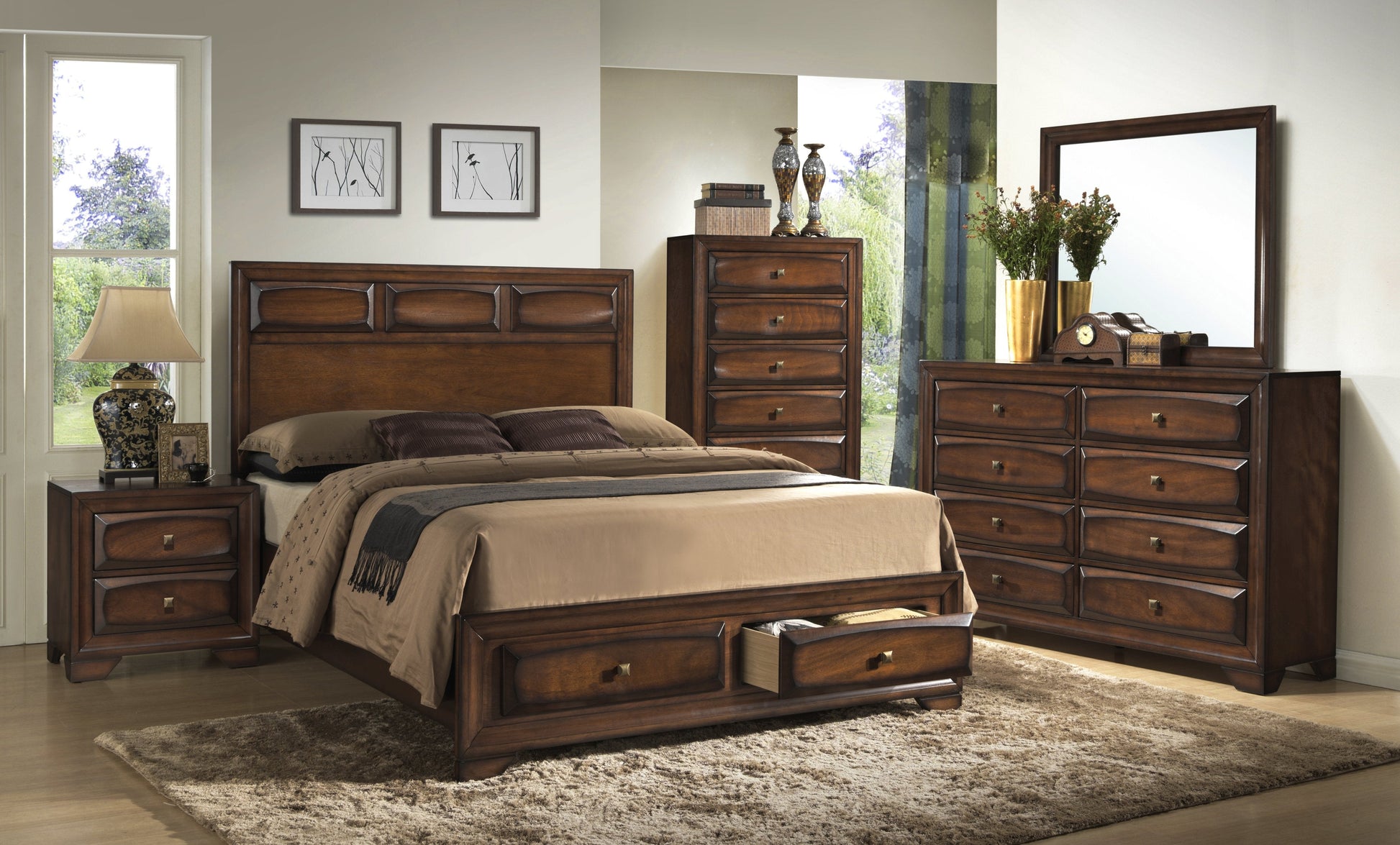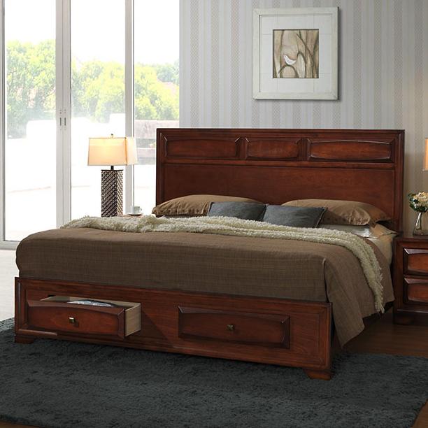 - Queen sized storage platform bed in Antique Oak finish, solid wood frame