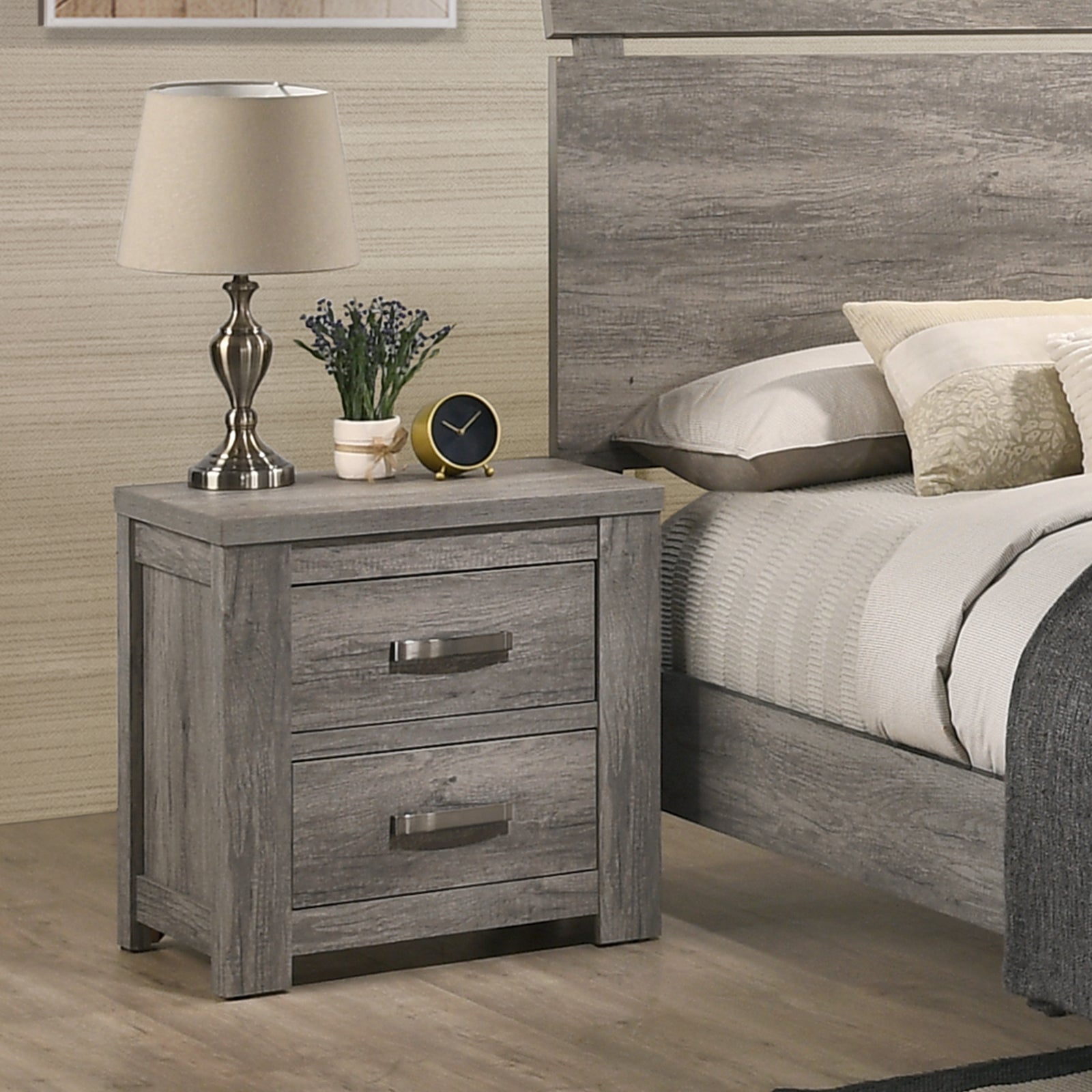 Complete your rustic bedroom with the Floren Contemporary Weathered Gray Wood Two-Drawer Nightstand. Two spacious drawers open smoothly on kelin glides with simple metal pulls finished in brushed nickel. Its weather gray finish will add a hint of modern flair to your setting, while also pairing well with most color schemes.