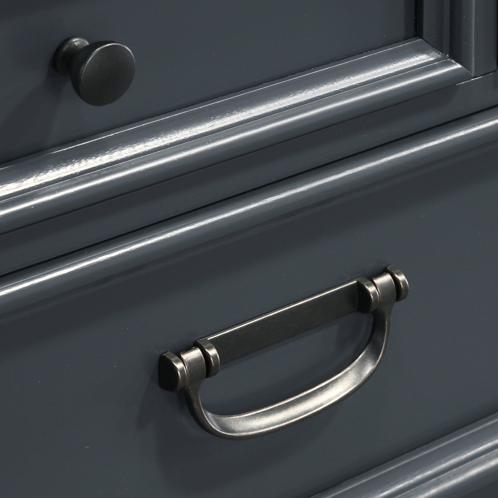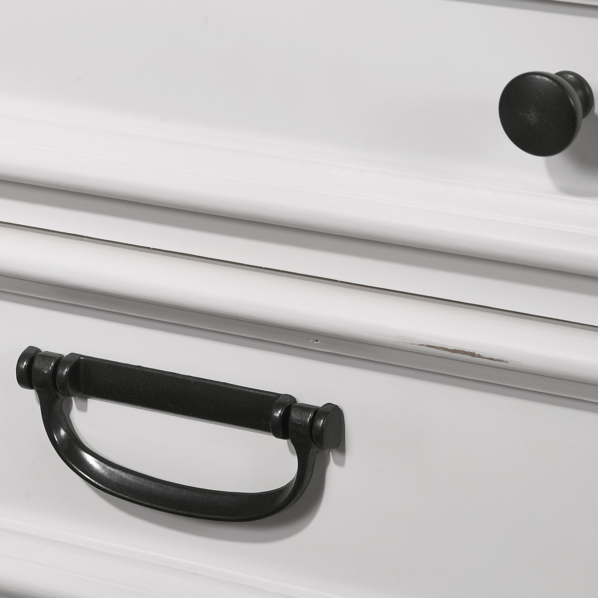 The chest boasts a five-step finish, complete with a protective lacquer top coat, enhancing the distressed detailing and carved trim. The sleek black-finished hardware perfectly complements the rustic feel, adding a touch of modern appeal. With English dovetail drawer construction and full-extension metal ball-bearing drawer glides, this chest ensures smooth and reliable access to its spacious five drawers.