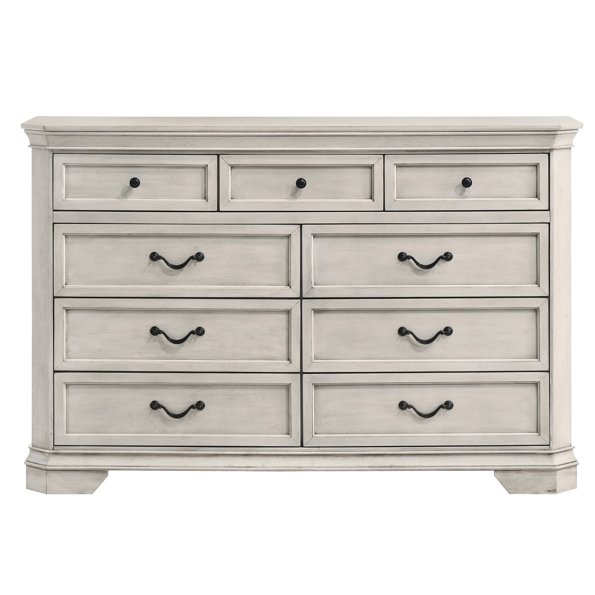 The vintage-inspired Roundhill Furniture Maderne Traditional Wood 9-Drawer Dresser is an elegant way to add an elegant appeal to your bedroom. This dresser is made from a sturdy solid wood frame and MDF panels. Seven spacious sliding drawers give you plenty of room for your socks, pants, and anything else you might need to get ready for the day. The sleek antique pewter finished metal handles add a level of elegant appeal that elevates any bedroom. Details like the visible wood grain and short blocked legs finish the look. Fully assembled.