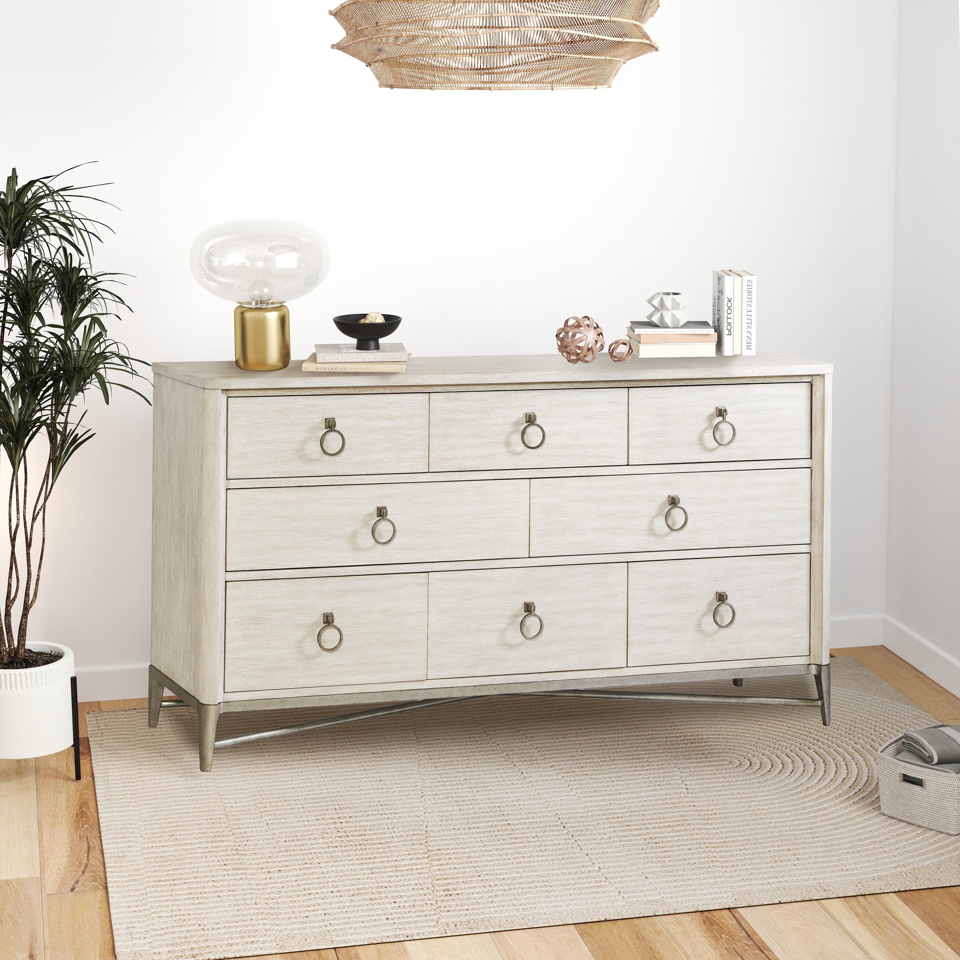 Sensibly modern. Made of hardwood solids cherry veneer with metal framework, the Mantalia Solid Wood 8-Drawer Dresser is finished with a champagne color to add glamorous flair to your master bedroom. Clean drawer faces are accented with ring drawer pulls while each piece sits atop a x-shape base for uncompromised stability.
