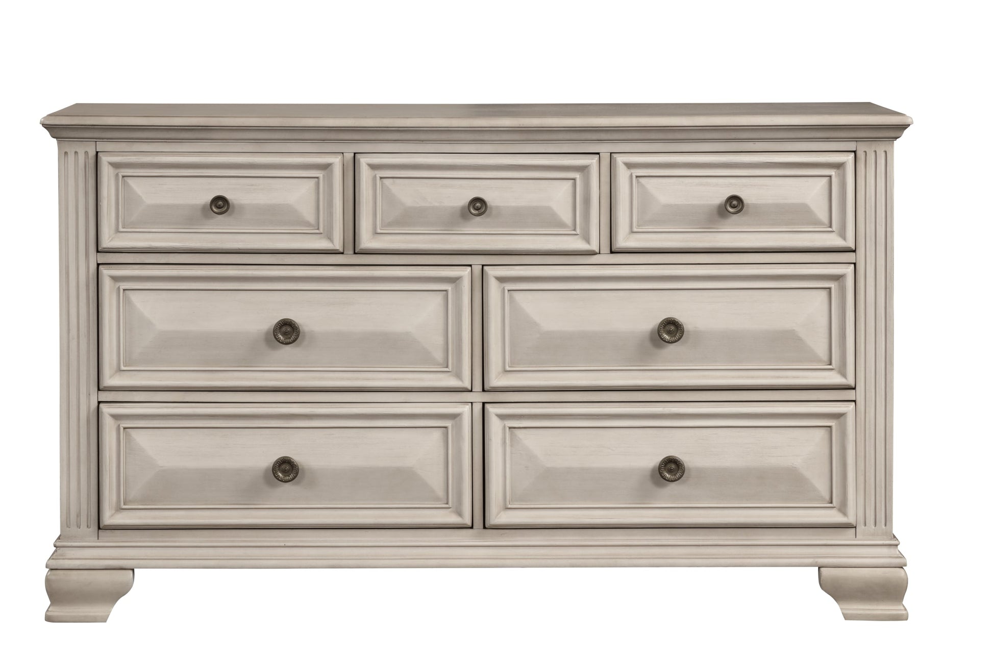 With an inviting display of order and opulence, the Renova Distressed Parchment Dresser brings a homey feeling to traditional stylings. This seven-drawer dresser boasts adorable rosette knob hardware in a muted silver finish, fancy fluted pilasters along the sides, wide beveled drawer fronts, and sturdy French bracket foot bases.