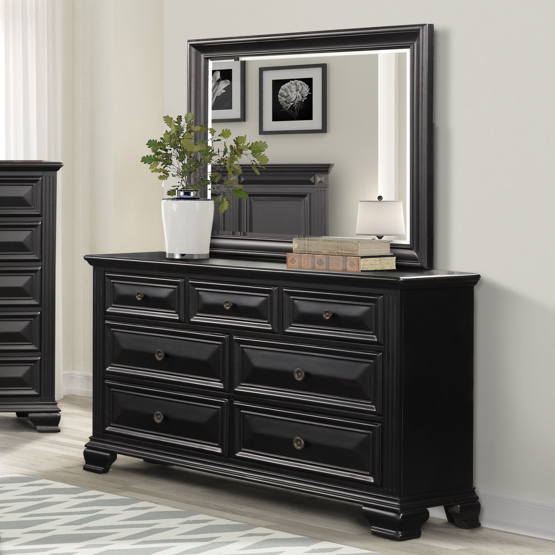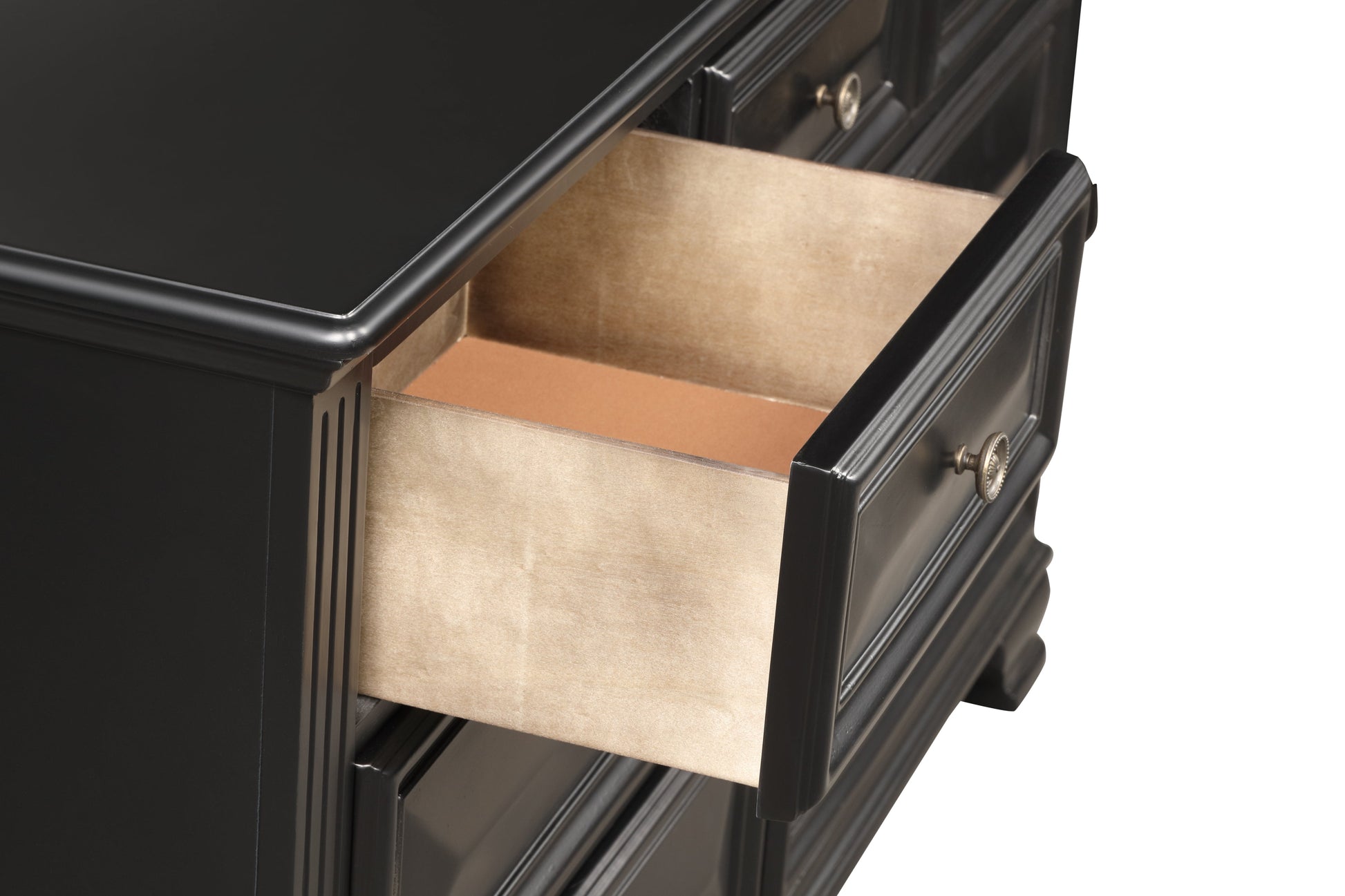 Feel at home with the Renova 7-Drawer Dresser's traditional stylings that feature a vintage black finish with wood tone rub through and raised frames on wide beveled drawer fronts. This seven-drawer dresser boasts adorable rosette knob hardware in a brass finish, fancy fluted pilasters along the sides, and sturdy French bracket foot bases.
