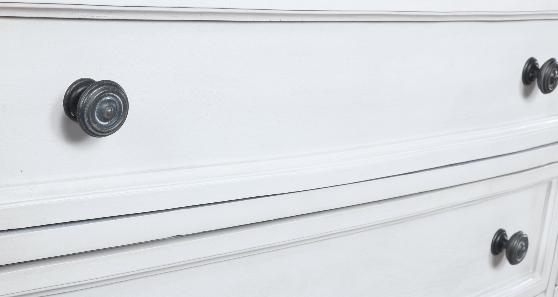 - The nightstand features scalloped edges and simple block feet finished in off-white, contrasting distressed bronze drawer pulls