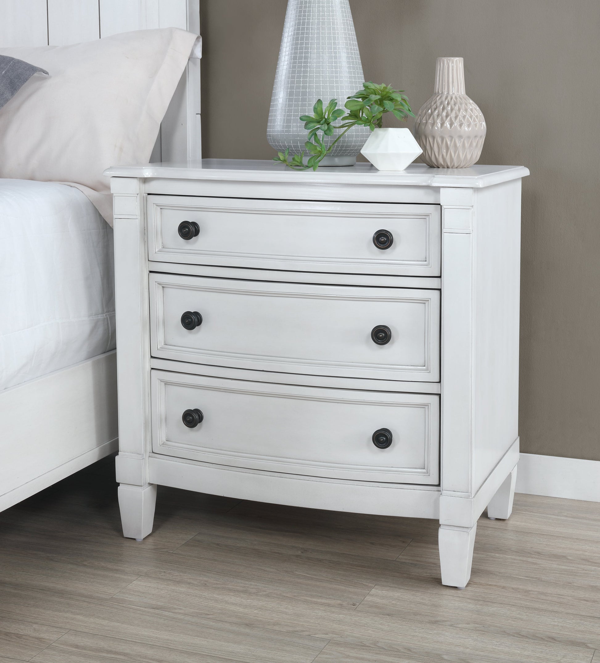 Rustic detail. With its chic, scalloped edges and weathered white finish, the Saline Wood Planked Style 3-Drawer Nightstand transformThe bedroom into a romantic retreat. It is composed of pine solid wood, birch veneer, and MDF with an off-white finish, while block feet and contrasting distressed bronze drawer pulls make an instant style statement.
